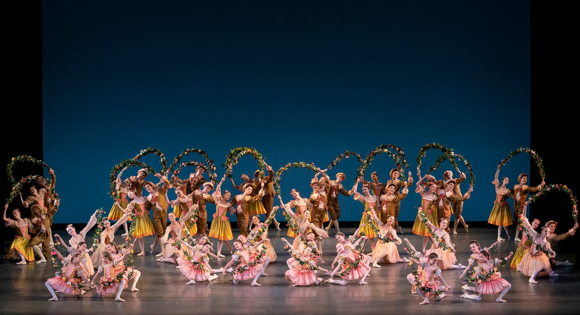 If, in "Barocco", the stage space was finite to be danced in, with the corps like a peristyle, rather than infinite and to be danced through, in Balanchine's 'Garland Dance' from "The Sleeping Beauty" it all but disappeared entirely, becoming an exuberantly blooming series of arbors, an avalanche of yellow, green and pink, rather like a late Monet in which form disappears into light and color, but here also, motion, leaving the viewer elated, awash in youth and spring, a perfect backdrop for Aurora.