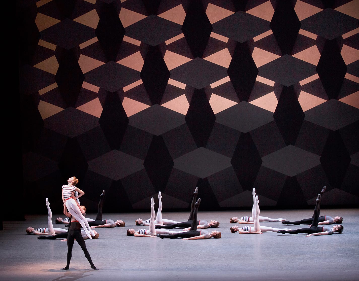 Justin Peck created “Everywhere We Go” in 2014, the year he was named the company’s resident choreo- grapher, while still in his twenties. It is a young choreo- grapher’s ballet, overflowing with inventive ideas and energy. There is no attempt to reduce movement to essentials here, or to capture deep emotion. The plethora of activity also reflects the cinematic drive of Sufjan Stevens’ score, which roars forth one moment, reduces itself to a tingling trickle the next, only to roar again like a giant machine. The cast is big, too, in keeping with the music: twenty-five dancers, including roles for seven principals, six soloists, and a corps of twelve.Many of the group dances feature semaphoric gestures and geometric formations reminiscent of Soviet gymnastic events of the 1920s, which celebrated the country’s industrialization. Kurt Jensen’s backdrop, which consists of a kaleidoscope of shifting black and white geometric shapes, adds to the impression. The costumes by former NYCB dancer, Janie Taylor, have the men dressed in shades of gray, the women in red, white, and blue that hint at nautical wear.