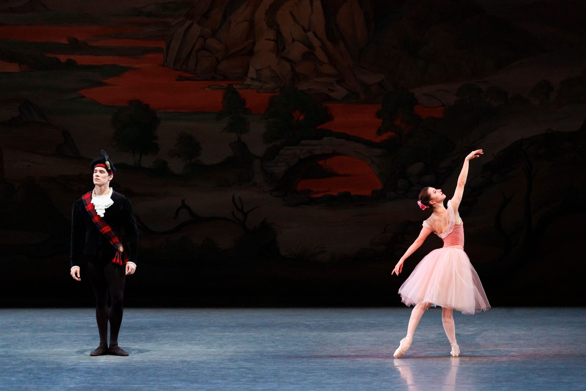 There were other dances to cheer about that evening, which opened with Indiana Woodward and Jovani Furlan heading off to Scotland via Balanchine’s “Scotch Symphony”. The first and third sections do feel like an animated travel poster with the kilted lads and bouncing lassies Highland flinging around, but the haunted center movement seems like a misty section of a luminous lost Romantic ballet. Furlan was a noble Scot, bowing politely to the little Scottish girl (Baily Jones, sweet-natured but lacking really crisp footwork) before he entered the magical forest, where he seemed to sense rather than see the sylph.