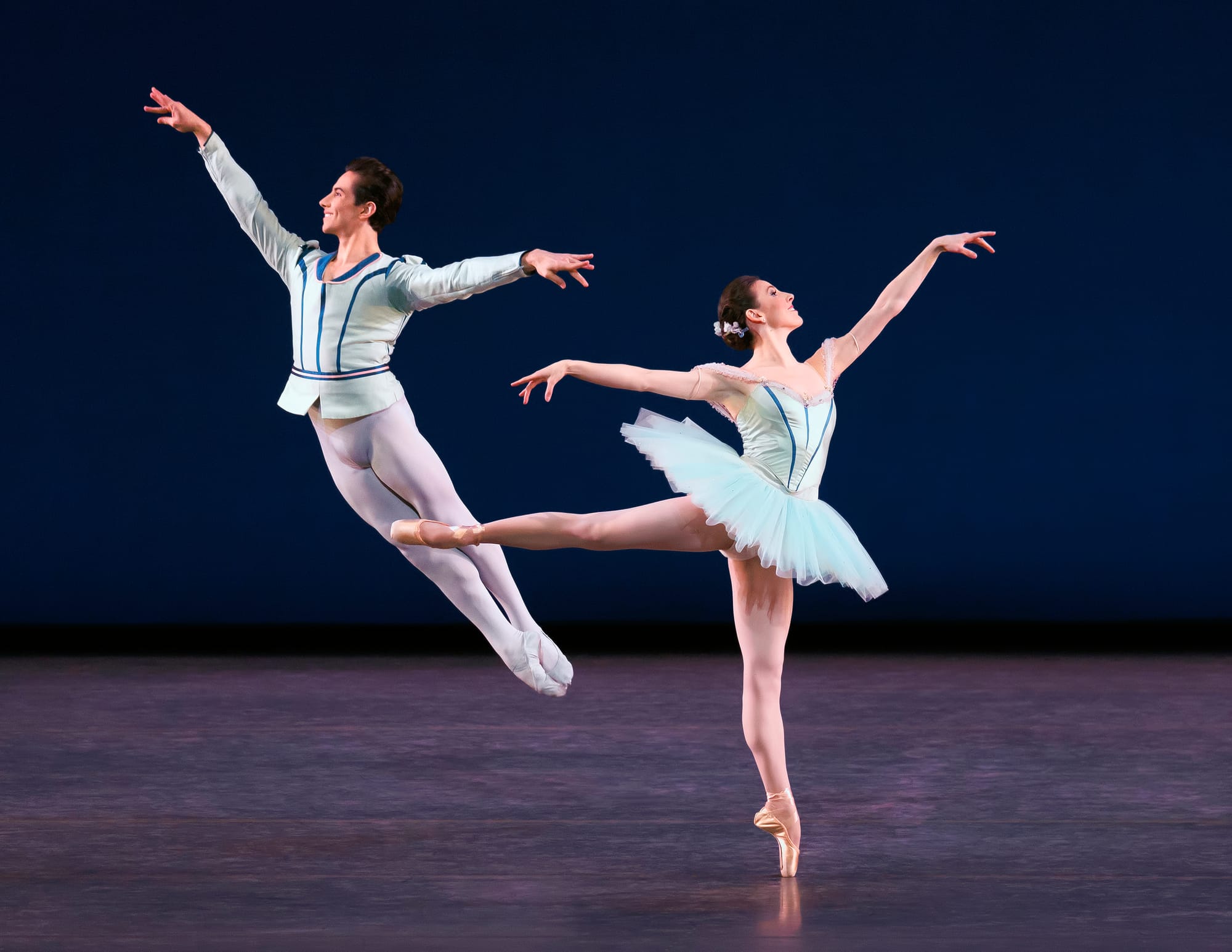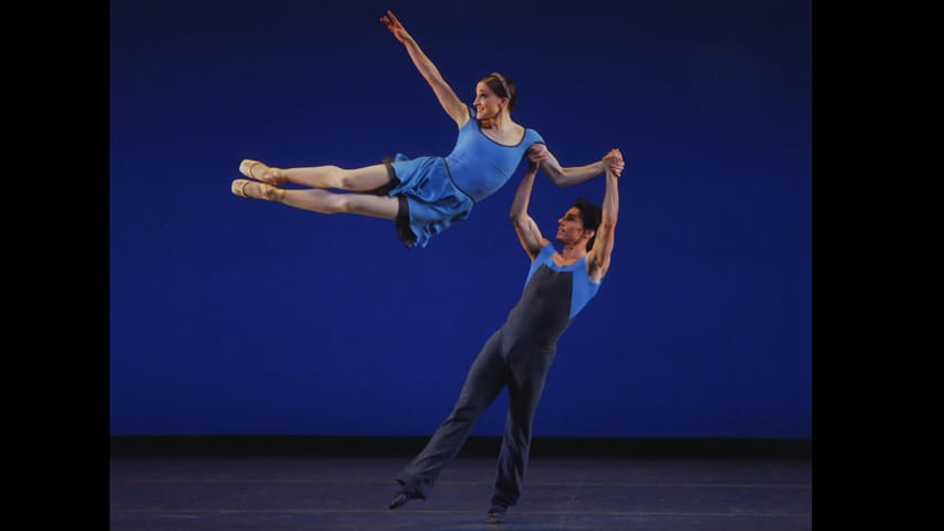 Balanchine's “Sylvia Pas de Deux”, to the lovely, danceable Delibes music, has another triumphant finale. It is a model of classical construction, with a delicate entrée, where the dancers enter slowly, and gently dance, arms apart, building up to more exciting technical challenges, and ending with an explosive coda. Balanchine has stripped his dance of all narrative background, and there is nothing of the nymph and her loving shepherd from the original story in the choreography, it is just pure dancing for its own sake.