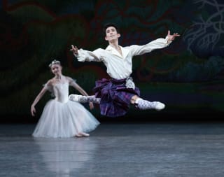 Martins, who originally set the work for Pennsylvania Ballet in 1985, compressed its two acts into one, which makes it seem extremely rushed. There is hardly room for character development when the performers are dashing from one scene to the next. Still, much of the problem on Saturday had to do with the casting. Bouder was a very earthly Sylph. Her realm is one of extroverted, full out virtuosity. The sweetly diaphanous Sylph didn’t suit her well. Huxley was an interesting, introspective James several years ago, but here he looked wooden, although technically as pristine as ever. Megan LeCrone was fine as James’ fiancée Effie, but she towered over Huxley, and would have been much better suited to the taller Veyette. Harrison Ball played Gurn, who loves Effie, for laughs, which is perhaps not the best way to interpret the role of a man steadfastly devoted to a young woman. After all, in Bournonville’s philosophy Gurn is the one who deserves to be loved, not James. Marika Anderson made a rather glamorous Madge, certainly different from the usual portrayal of this character as an ancient hag. Performances of this program continue through Wednesday before the company moves on to other repertory.