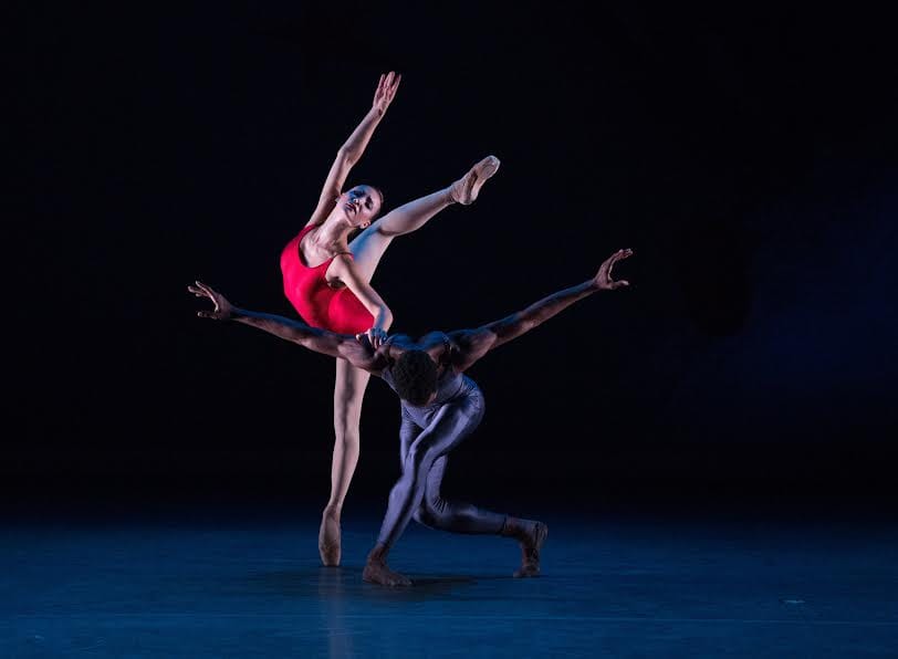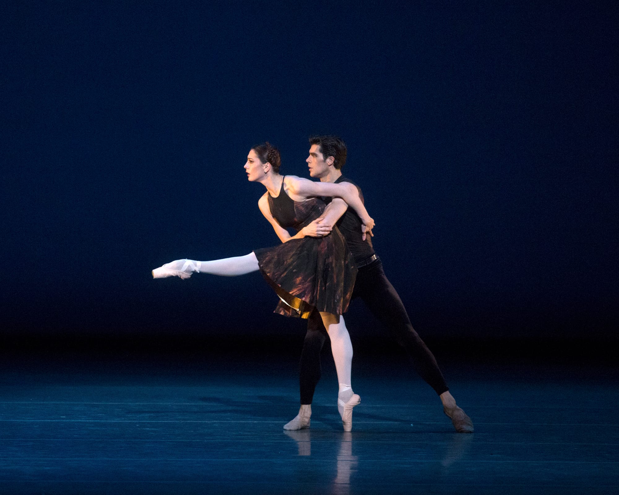 "Piano Concerto #1" returns to the malleable ambiguity of the first work and is a haunting ballet. The two main couples (Christine Shevchenko with Calvin Royal III and Skylar Brandt with Gabe Stone Shayer) resemble each other, especially now that Brandt's hair is dark, and may be siblings or doubles. To me, this performance suggested an older and younger self, watching each other through some trick of time. The dancing was stellar; Royal has a strong presence, a striking wingspan and a beautiful, clear arabesque. Shayer seemed to float through those Bolshoi jumps originated by Ivan Vasiliev. Vasiliev made them look difficult and heroic but Shayer made them look beautiful.