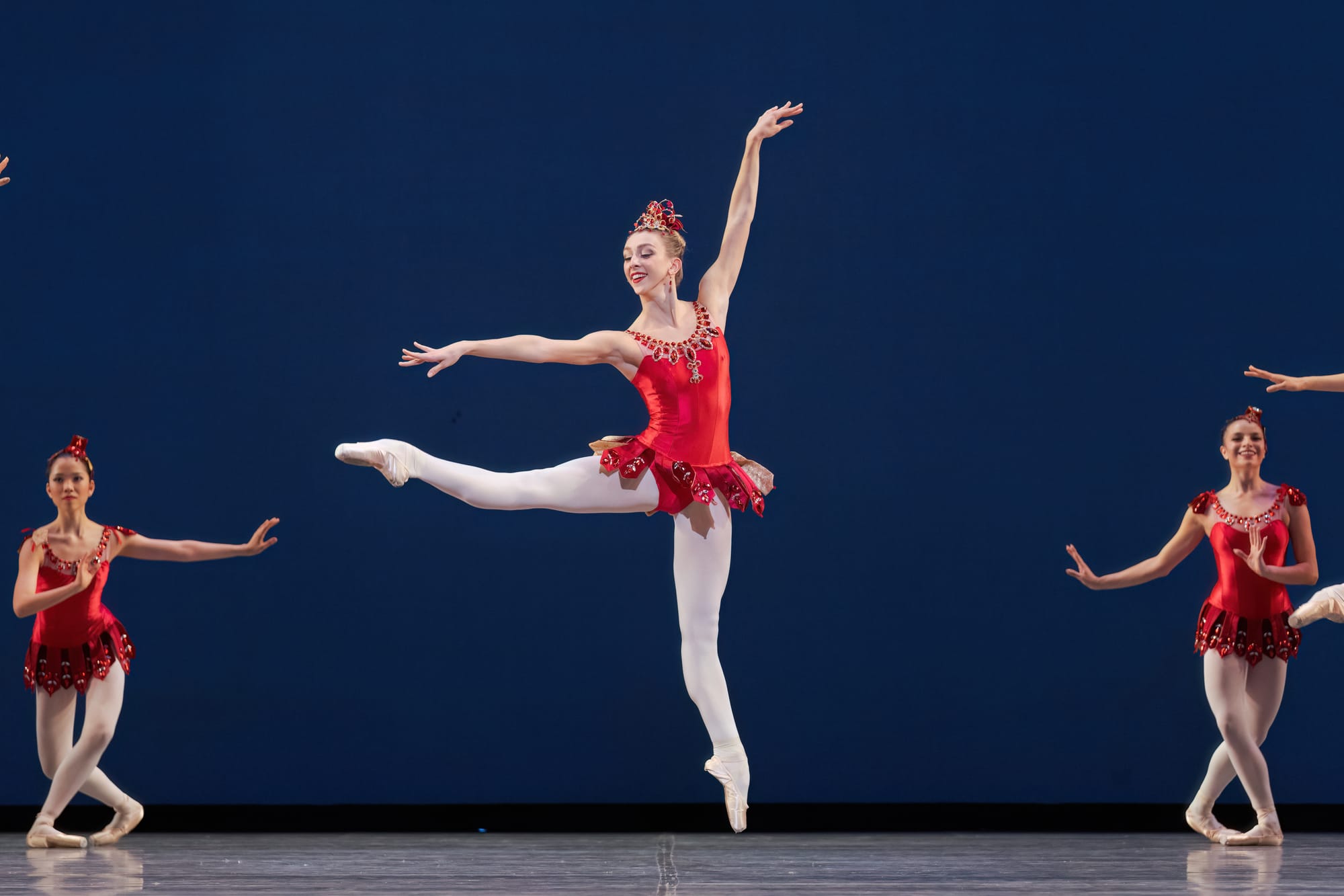 "Diamonds" featured Heather Ogden, the veteran performer of the evening. Having worked closely with Suzanne Farrell over the years, this is a special role for her. Her level of experience really shows here, as she led the ensemble through the entire piece like a gracious queen. While the movement style of "Diamonds" is noble and formal, she also managed to bring a sense of freedom and abandon to her performance. The pas de deux of Ogden with Ben Rudisin was the stuff ballet dreams are made of, all controlled développés and deep leans back. The pas de deux builds in a steady crescendo, from the stately walks in the beginning to the dramatic promenades at the end, perfectly embodying the rises and falls of Pyotr Ilyich Tchaikovsky's third symphony. While a strong partner, Rudisin was having an off night and struggled throughout his variation, falling out of a jump in the manège resulting in a two footed landing and falling off his relevé in the pirouettes à la seconde. He recovered well, but these were uncharacteristic mistakes for him. The corps de ballet were "on" though, giving a clean and inspired performance.