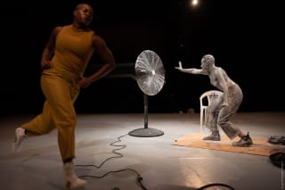 Gill herself provided the most striking image. As Edwards sat and watched from a folding chair, Gill dragged a heavy barrel into the center of the stage, stripped off her top, and plunged head first into the barrel top. When she emerged, the top half of her body was covered in a thin clay coating, eyes closed against the mixture, looking like a death mask, but standing alive in our midst. She stood, arms raised to a large drying fan for several moments, then slowly turned in the 360-degree performing space to present to every corner of the audience. Edwards rose and took off in a casual jog around a stage, framing Gill, without paying any attention to the outstretched arms or silent cry. Gill slid to the ground and slithered into a corner of the stage, prostrate, gray and lifeless.