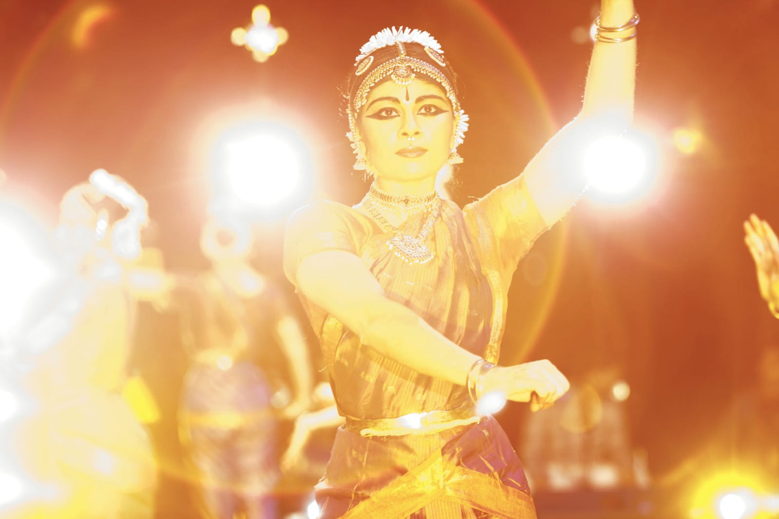 The elder dancer had a solo to a keening song, sung by Preethy Mahesh (the music was live). The detailed and expressive movements looked like a spontaneous mimed reaction to the words, so it was a shame that there was no translation. The directness and clarity of the movements, though, seemed to reach the audience without needing words. The group dances, often led by Aparna Ramaswamy, were both sensuous and intense, as the dancers used their shimmering hands with a gleaming control. Aparna Ramaswamy used her beauty, especially those dark luminous eyes, to share all the glorious details, the little head trills, the quick changes of direction, and most of all the pure fun of moving, which was cosmic enough for the audience.