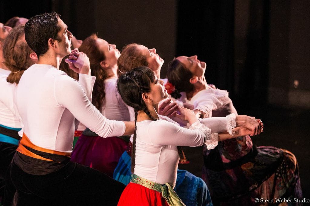 "Frida", Sokolow's 1997 meditation on the life and death of the artist Frida Kahlo, was the only work that relied on recorded music, an amalgam of traditional Mexican melodies and excerpts from several Mexican and Spanish classical composers. It was divided into various scenes, each beginning with a projection of a Kahlo painting, setting the mood. The piece was earnest, clear and stately, but choreographically rather static; even the Mexican fiesta, complete with long colorful skirts and lively music and a pinata, felt inert. Lauren Naslund, as Kahlo, gave a dignified and intense performance and there were some striking vignettes, especially the brief depiction of Kahlo's difficulties with Diego Rivera (a fiercely understated Luis Gabriel Zaragoza), as he just held out his arms to block her way. But unlike the other works, this did not seem to get under the surface of the subject, though it did show the dancers' many strengths--their easy and free movements, their straightforward, unmelodramatic approach, and their belief, completely justified, in the power of these dances.