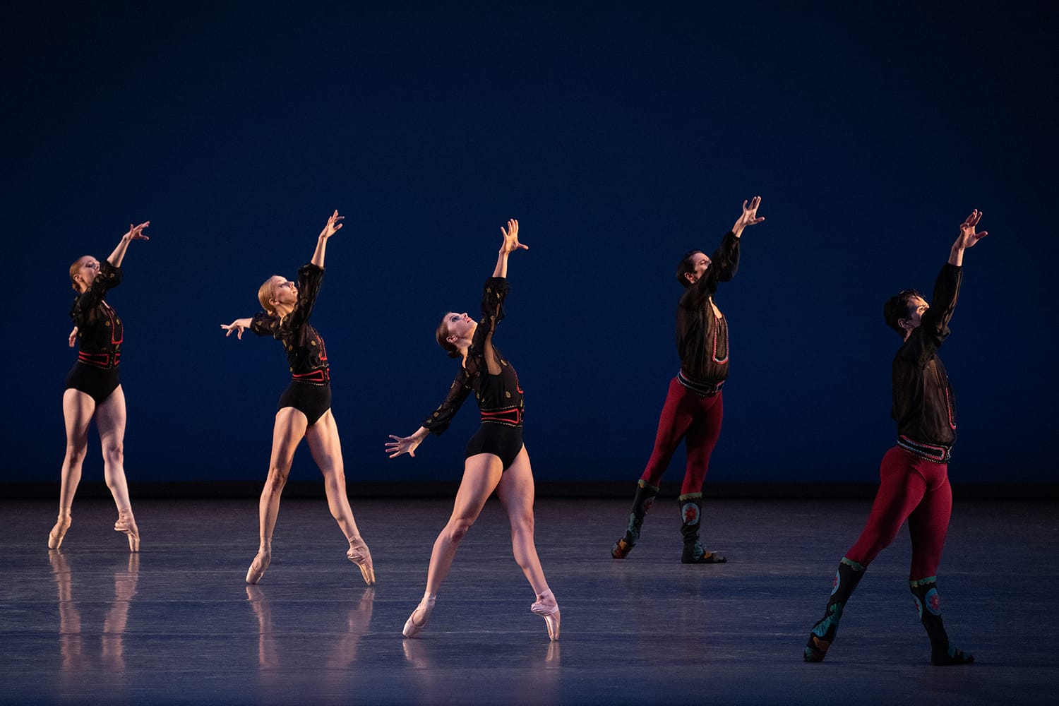 Also new this season is Edwaard Liang’s “Lineage,” with a score by Oliver Davis and costumes by Anna Sui. Both “The Shaded Line” and “Lineage” were part of the NYCB’s fall gala, which features costumes by fashion designers. The Liang work features four couples backed by a corps of eight. It is a plotless work with a vaguely Eastern European feel in occasional folk-like gestures and in the dark red and blue costumes, in which the men wear knee-high boots and women have outlines on their bodices that resemble the aprons of peasant dresses. Mostly, though, the work centers on duets for Ashley Bouder and Peter Walker, Megan Fairchild and Gonzalo Garcia, and Emilie Gerrity and Jovani Furlan that are in the hoist and grapple mode perfected years ago by choreographers like Kenneth MacMillan. This movement results in awkward transitions in and out of equally awkward lifts that often have the women splay-legged over the head of their partners or twisted around the men’s bodies like pieces of stiffened rope. Then, just to add to the spectacle, there is a showy dance segment for Roman Mejia with a lot of jumps and turns meant to get an audience cheering. Meanwhile, Mejia’s partner, Indiana Woodward, has little to do but show up. Once again, newcomer Jovani Furlan impressed with his attentive partnering and clean movement. Megan Fairchild also was notable. Cast against type, she was lovely in a slow duet with Garcia that allowed her to expand and breathe into a role rather than impress with speed and bravura technique.