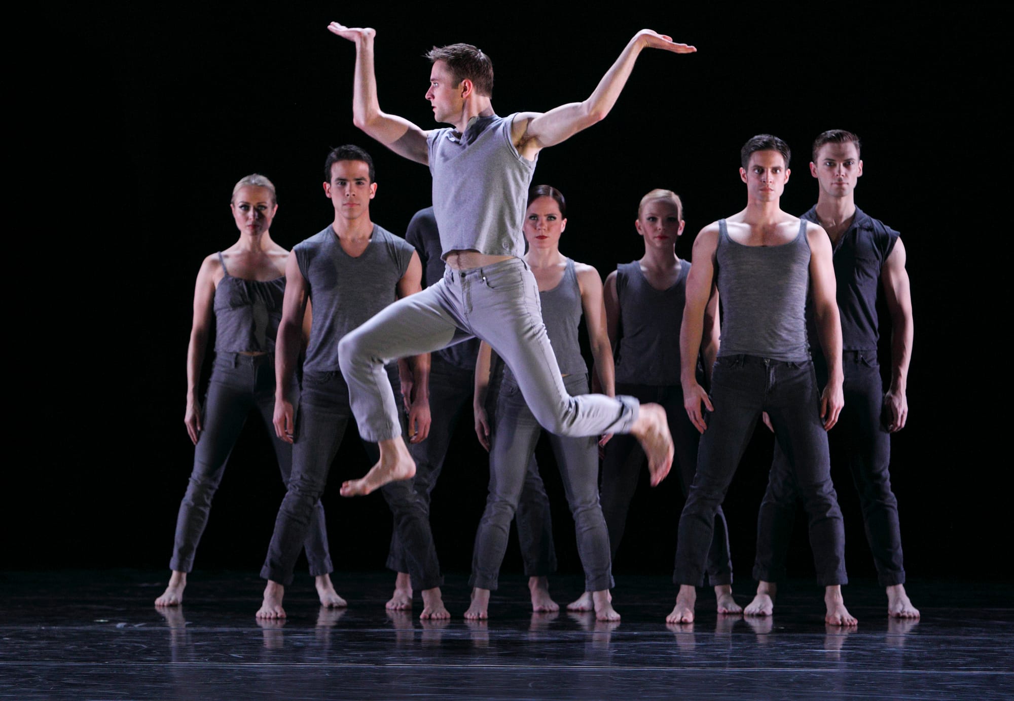 Trusnovec had a gentle, meditative solo which looked like a riff on Taylor's well-known Aureole solo (set to Handel), as he struck the familiar wide-armed, off-balance pose only to crumple up and crawl away. He did find a buddy in Kleinendorst, and they bonded over joyful jumps, though Trusnovec does end up alone, reaching outwards, an elegiac but not tragic ending, as he remained on the happy shore.