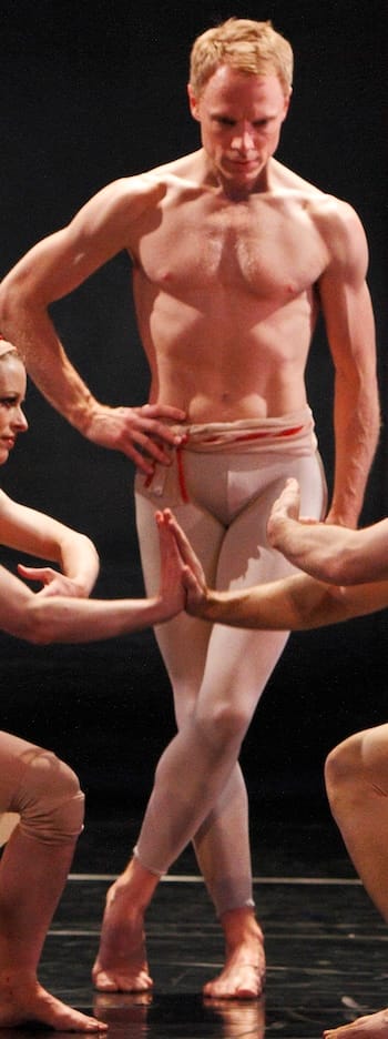 The couple in yellow, Eran Bugge and Michael Novak, provided a bit of relief and they sparkled through the skittering steps. The lifts were particularly effective, as Bugge seemed to float effortlessly up onto Novak's waiting shoulders, a physical metaphor for love and trust.