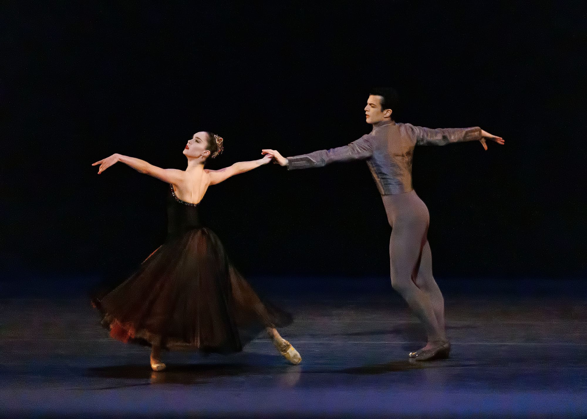 Mira Nadon and Gilbert Bolden III debuted as the third couple. Both dancers are wonderfully intuitive and imaginative performers and they seemed to have thought carefully about their pas de deux, which they danced with an almost violent abandon full of dramatic pleading and furious rejection until Nadon abased herself, kneeling in front of Bolden. It was gripping, but the mixture of pretty twirling and daredevil lifts looked a bit like a high school dance Apache.