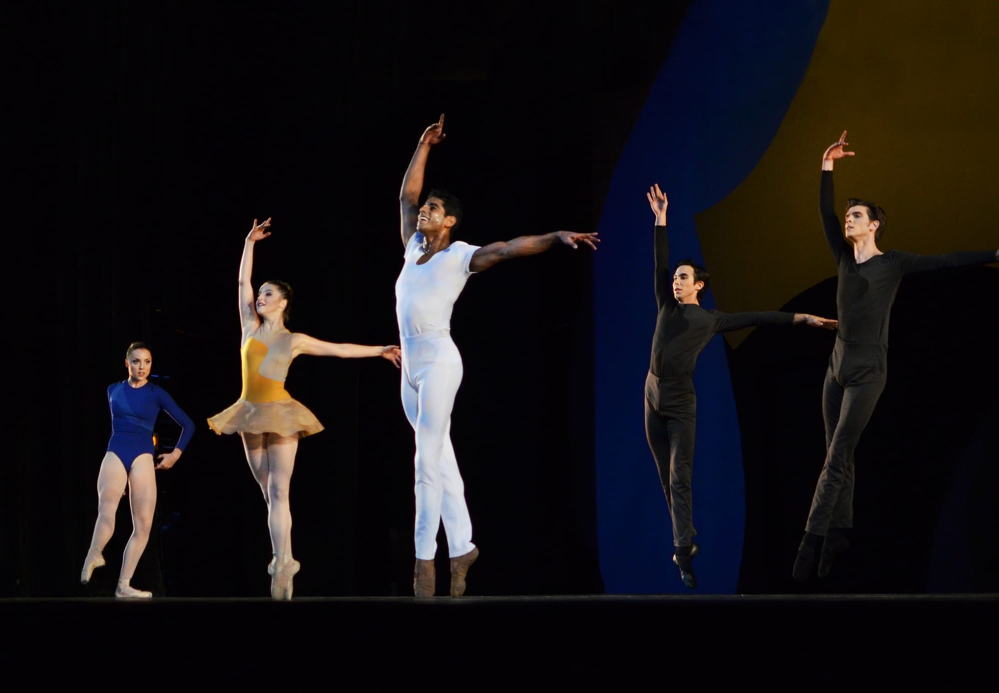 Joshua Beamish's 2014 "Rouge et Noir" was colorful, but it was neither light-hearted nor intriguing. It was set to Shostakovich's Piano Trio # 2, and ignored all of the sparkling folk-influenced rhythms and mysterious undertones. These were however, picked up by the set (by Michael Howard) which was a colorful Matisse-like collage and the costumes (by B Michael) which echoed the shapes of the backdrop and caught the combination of the music's infectious swing and wry modernism.