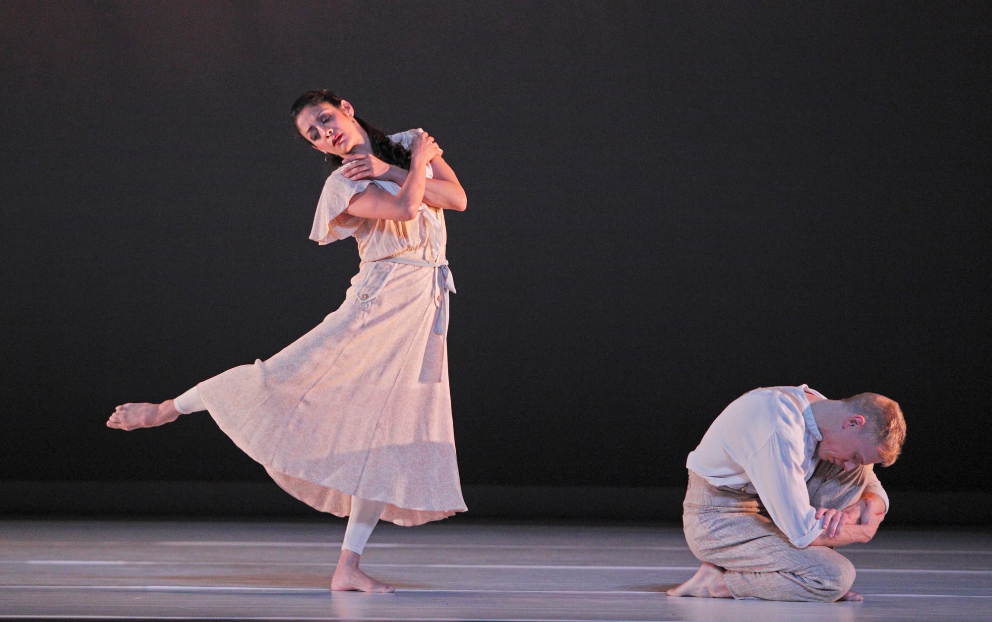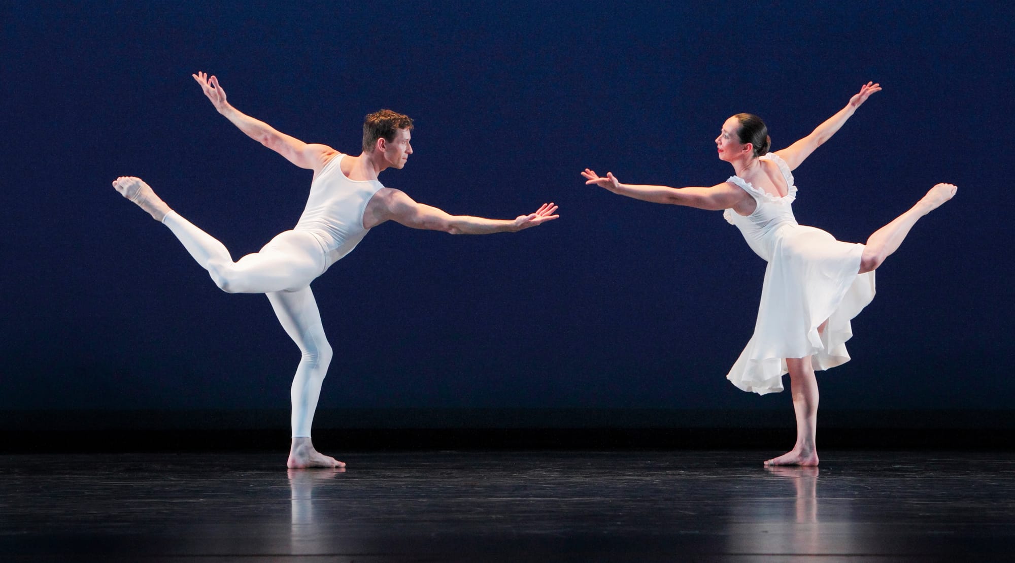 "Eventide", to music by Ralph Vaughan Williams, was on firmer ground. Its backdrop suggesting rural England and the early twentieth century, both by Santo Loquasto, place it in Thomas Hardy country and the dances are nostalgic without sentimentality. The five couples, for all the pink misty atmosphere, are not uniformly happy, as the brief, unsettling dance for Eran Bugge and Robert Kleinendorst showed. His strutting walk and abrupt approach reeked of selfish sensuality, though I missed the casual cruelty that Andrew Asnes, its originator, showed; Kleinendorst seemed a bit as if he were trying to live up to an image, swaggering a bit too broadly. Bugge was haunting as his helpless, hopeless victim and for the first time I realized that in the elegiac finale, as the ghostly dancers drifted slowly around, each couple stepping into the light for a brief reprise, that her arms reached out to emptiness as Kleinendorst slipped through.