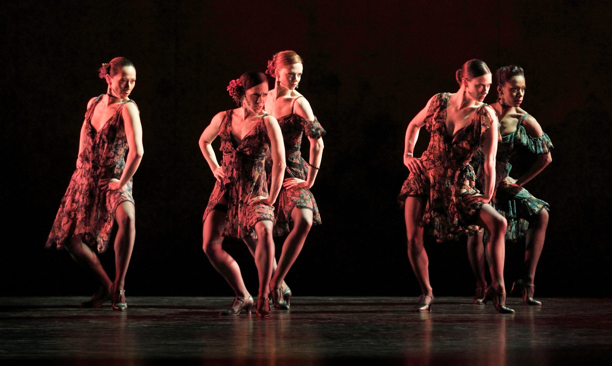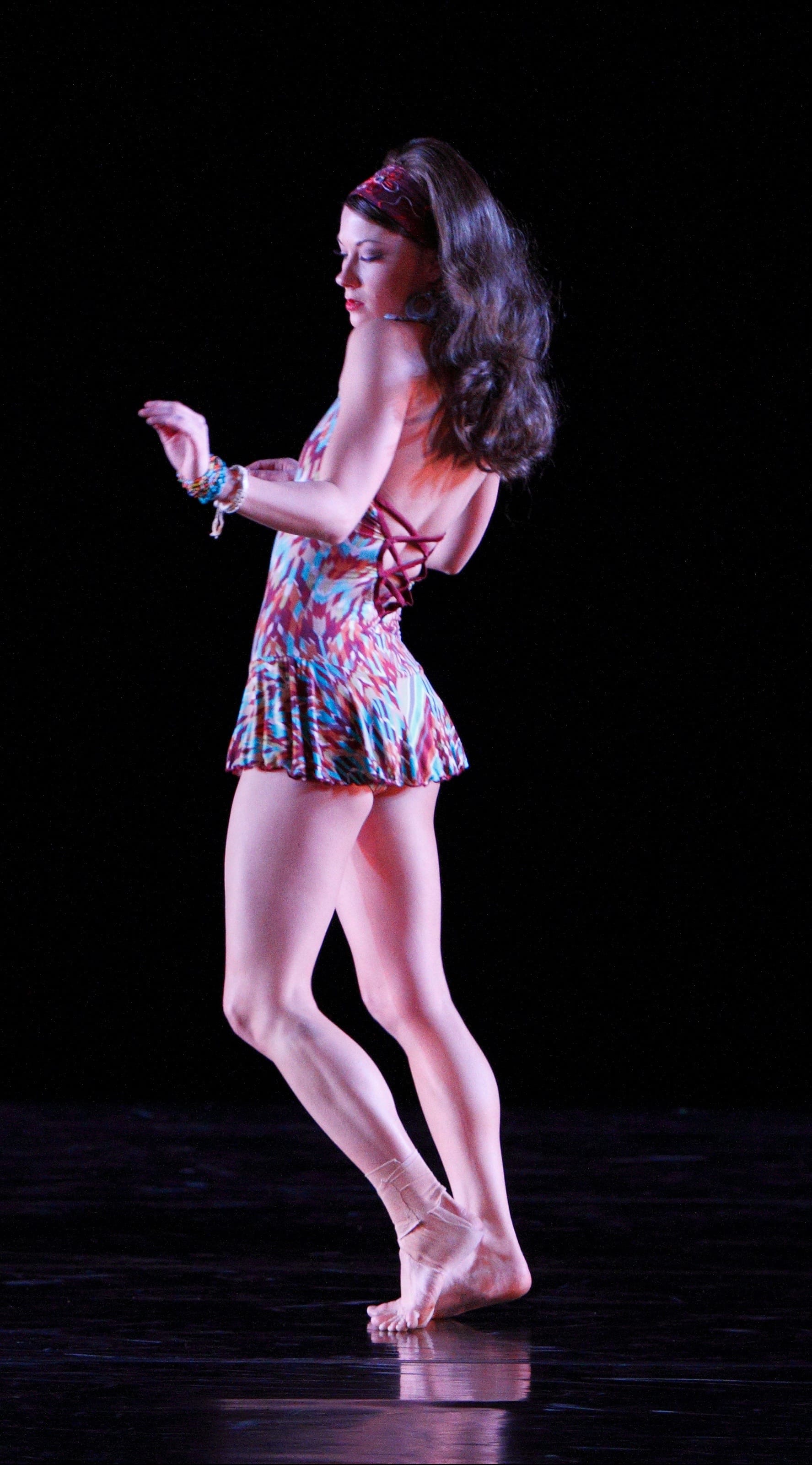 There is no love in "Piazzolla Caldera", Taylor's exploration of the tango milieu (without any tango steps). The deep red, harshly lit sets and the seedy costumes (again by Loquasto) combine with the hauntingly plaintive music by Astor Piazzolla to show a bar just west of Hades, where lost souls combine heat with emptiness. It is one of Taylor's bleakest works. Khobdeh was especially moving as the odd girl out, dancing with a bitter bravado concealing a desperate heart. Her solo had a sullen vulnerability as she reached out for her imaginary partner, looking in vain for someone to save her.