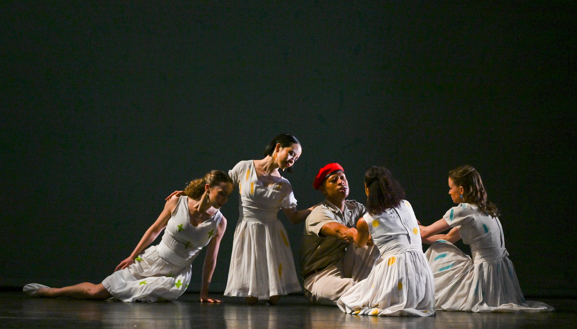 There were moments of quiet rapture as well as “Fancy Free” hijinks in “Sunset”, as the opening group of soldiers in an abstract park designed by Alex Katz danced and flirted with the four women in white to Elgar’s “Serenade in E minor for Strings”. Alex Clayton was a dancing dynamo, tossing off one handed cartwheels and soaring jumps as he tried with a vulnerable bravado to impress the girls. Taylor used the soaring, almost introspective music rather like Sir Frederick Ashton did in his “Enigma Variations”. Both choreographers have two companions (here, Duveneck and Harnarge) move through the music in a conversation, mixing in everyday moves (Taylor’s soldiers tie their shoes, straighten their ties, put their hands in their pockets, while Ashton’s Jaeger cleans his glasses) before being joined by a woman (a lyrically innocent Pearman), and who turn their backs to the audience, link hands, and rush to the back of the stage, catching the crest of the music. I don’t know if Taylor had seen “Enigma Variations” (choreographed in 1968), but both works use Elgar to glowing effect.