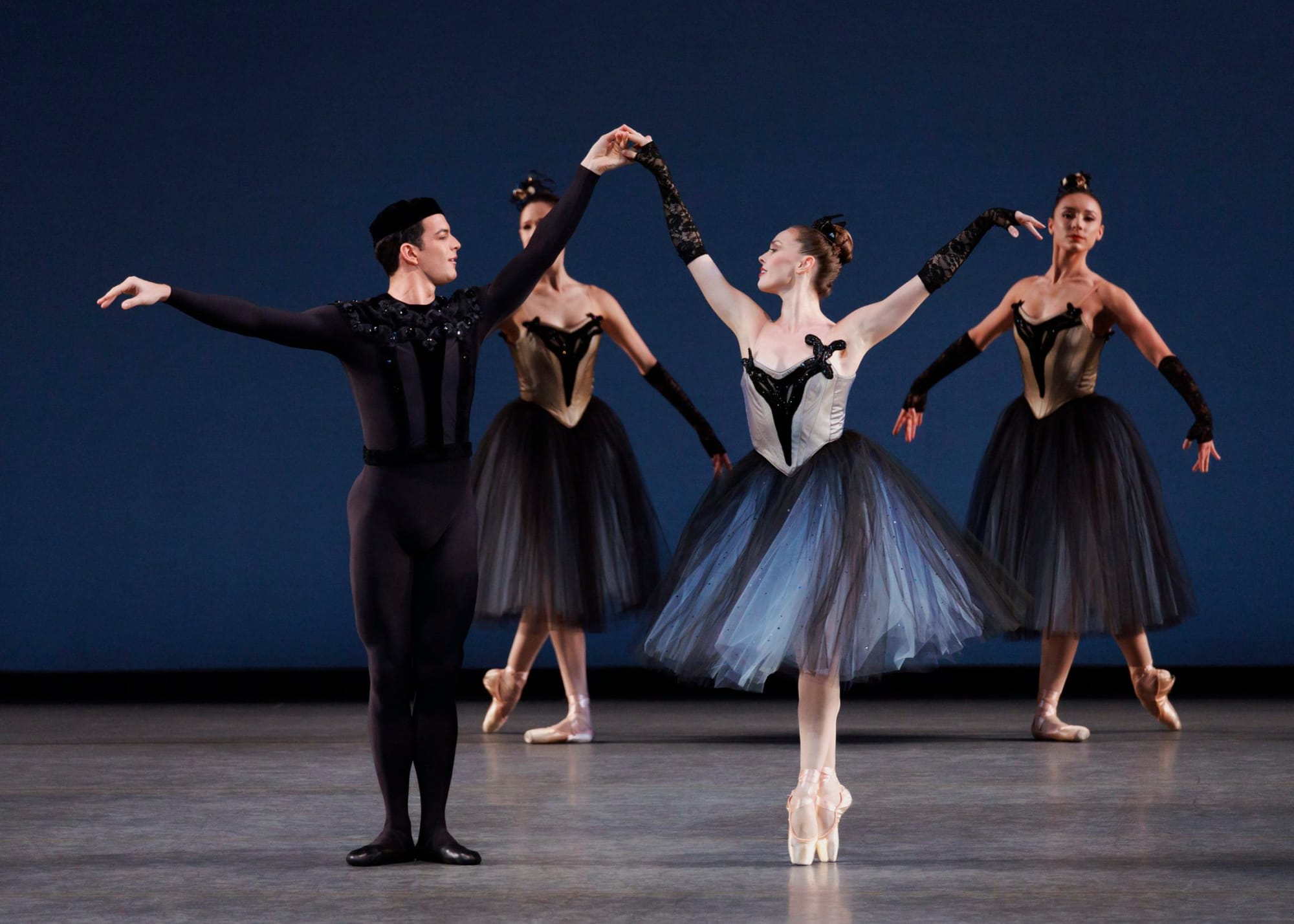 “Bourrée Fantasque” is a somewhat uneasy mixture of comedy, mystery, and bravura set to delightfully chic music by Emmanuel Chabrier. The costumes, by Karinska, are also delightfully chic, with the men in black berets and the women in glorious tutus. The opening movement, danced by Mira Nadon and Andres Zuniga in his debut, plays with a tall girl and a shorter man, and their somewhat goofy attempts to connect. The pair downplayed the slapstick (Nadon didn’t whack Zuniga’s head with a dangerous vigor) and concentrated on the fast, elegant footwork and witty, elegant little hand gestures—Nadon flutters a very mean fan. The movement exploded with exuberant chic.