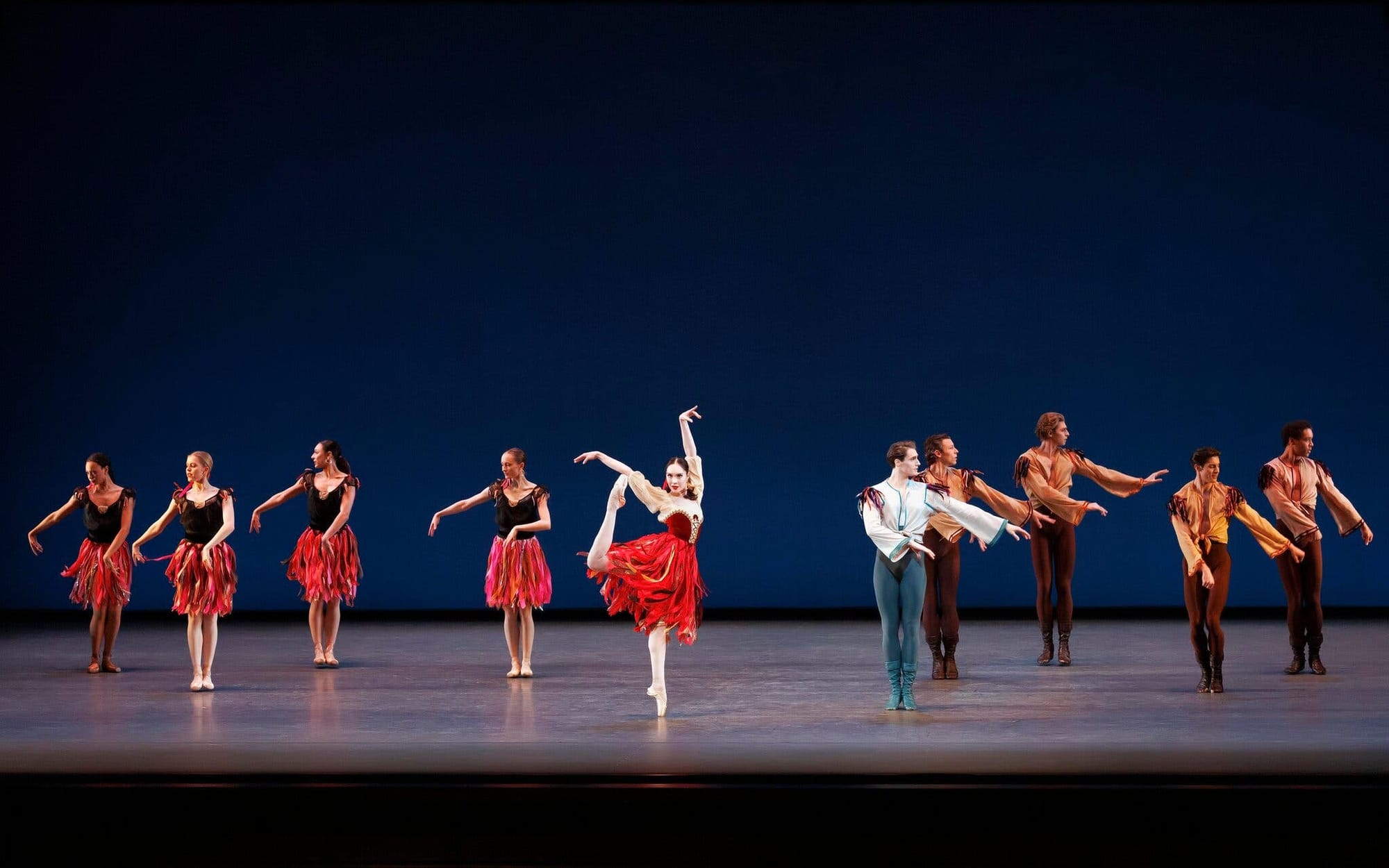 Emma von Enck and Victor Abreu led the Spanish-inflected third movement with irresistibly crisp dancing, flying through the fast little steps and quick jumps. The finale, as the first two cohorts poured on, was a thrilling, impeccably rehearsed panorama of shifting shapes, with circles and lines forming and reforming with a shimmering geometry; it was like watching a drill team in heaven.