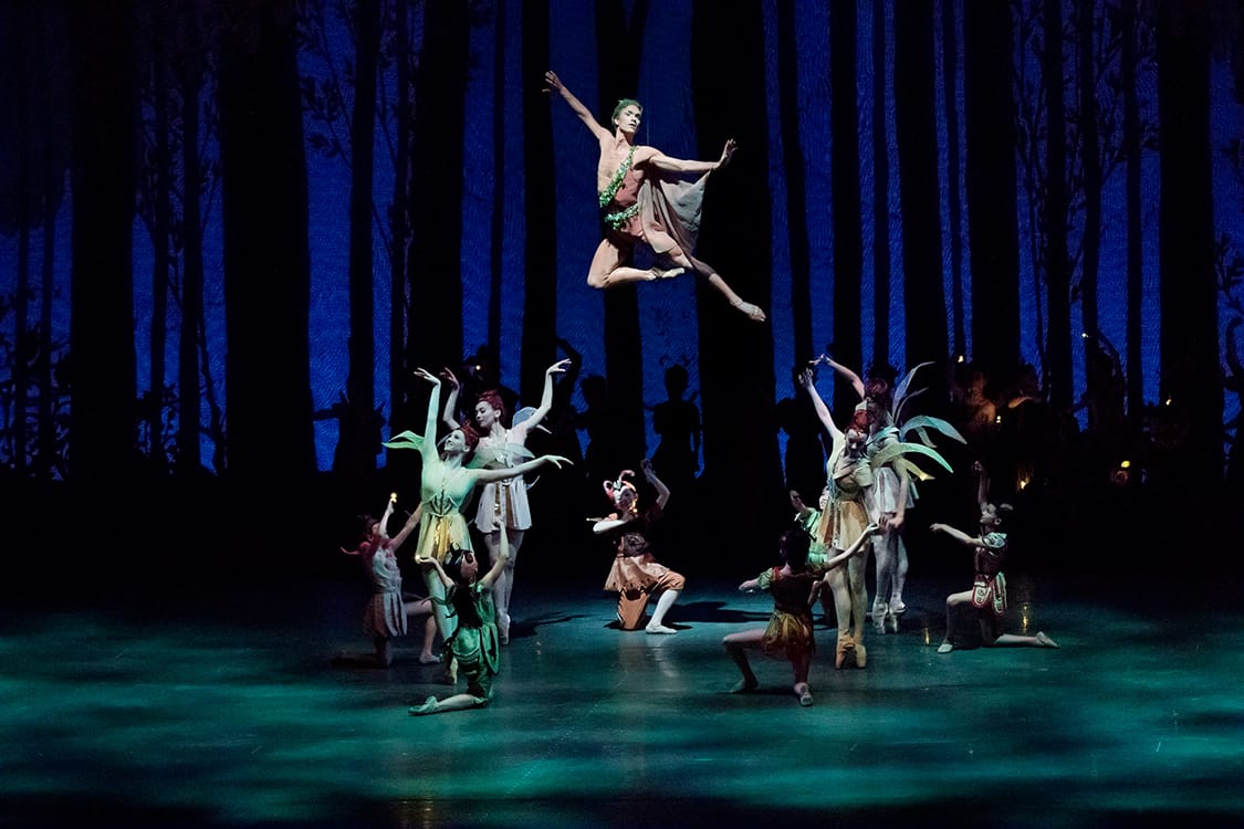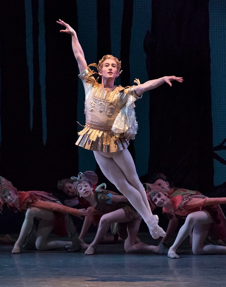 Act II of the ballet centers on the wedding of the couples, as well as of Theseus (Silas Farley) and Hippolyta. But the highlight in this act is a duet in the accompanying divertissement, here danced by Sterling Hyltin and Amar Ramasar. It’s going to take a while to forget Ramasar’s recent firing and subsequent reinstatement, but there is no denying he is a major talent and, as such, an asset to New York City Ballet. In contrast to the Oberon/Titania couple, this duet is usually performed by a small woman and a tall man. Hyltin’s delicacy and precision were heightened by Ramasar’s more open dynamism, and the dance, with its swooning romanticism, was quite beautiful. The weddings, though, are not the culmination of the ballet. In a final scene, Puck, surrounded by the denizens of the fairy kingdom, and with fairy lights dancing in the darkened forest behind him, rises into the heavens. It’s a final enchanting element to the ballet.
