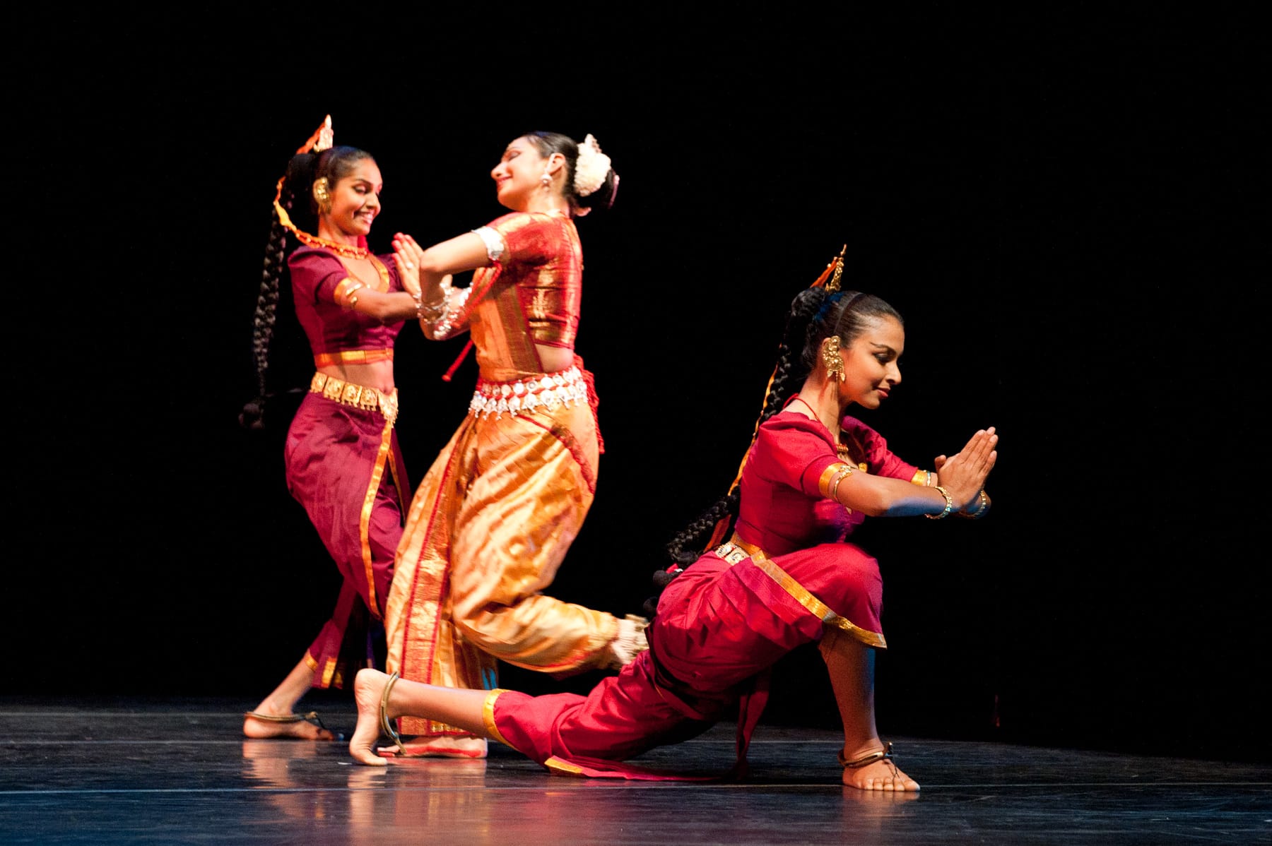 The Nrityagram Dance Company is a hybrid, a modern take on traditional Indian, specifically Odissi, temple dances. That is, the company uses the historical technique in a theatrical manner. For this visit, the three Odissi dancers were joined by two Kandyan dancers (Kandyan dance is also a temple dance) from Sri Lanka, and the two related styles made an interesting contrast. The pieces had live music, traditional Indian musicians and singers, augmented by a Sri Lankan Kandyan drum. The music, to western ears, combined a hypnotic droning sound (the bamboo flute) with rhythmic percussive sounds. The music was punctuated by the dancer's delicate, bare-footed stomps augmented by tinkling ankle bracelets. As the old rhyme says, "with bells on her toes, she shall have music wherever she goes."