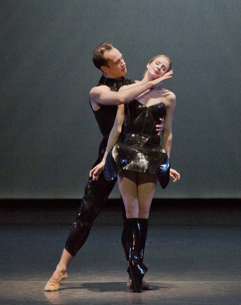 Benjamin Millepied's "Neverwhere" (one of his overly-cute titles) had designs by Iris Van Herpen, black, short, and shiny. The introductory film made much of the problems of adapting the black plastic three-dimensional shapes she came up with to dancewear, but the final result looked like black sequined spandex, with the girls in short panniers and black boots, which looked quite striking when the lights hit them. The lighting (by Mark Stanley) was also striking, making a triangle of light to introduce the different movements. The choreography wasn't as memorable, as the six dancers ambled through it with stony faces. Tyler Angle and Sterling Hyltin had a rather lengthy pas de deux, which showed off her delicate floating quality, but ended inconsequentially.