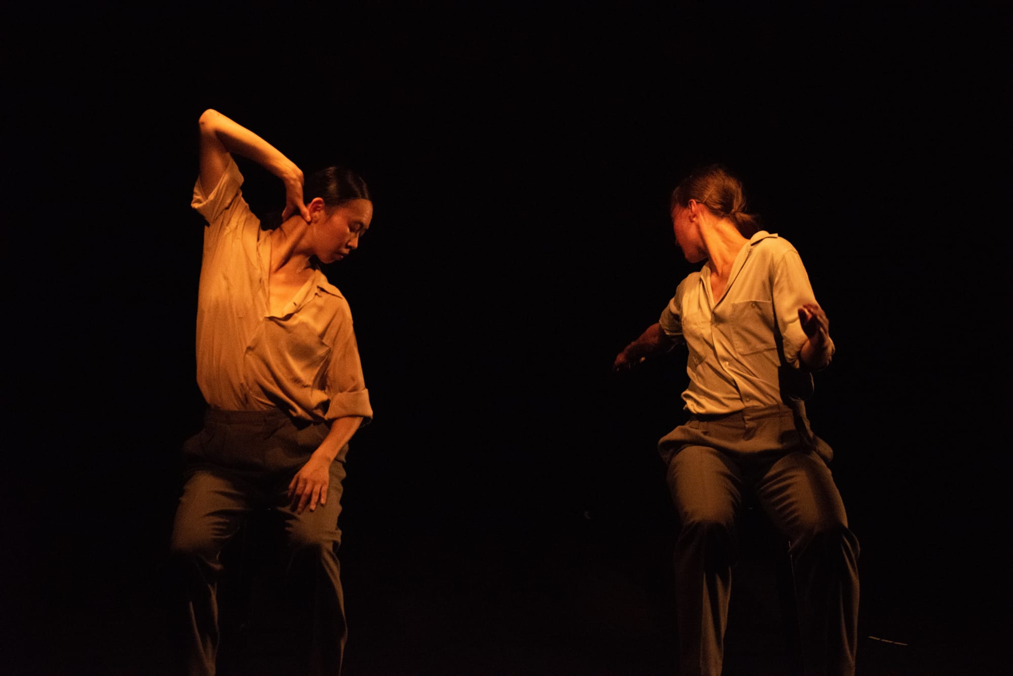 Although easily differentiated by their faces, Yuika Hashimoto and Laura Maria Poletti were like identical sides of a coin. Their bodies, matching high ponytails, swirling skirts, and movements made them twins, and the sharp shadows projected against the back screen were indistinguishable.