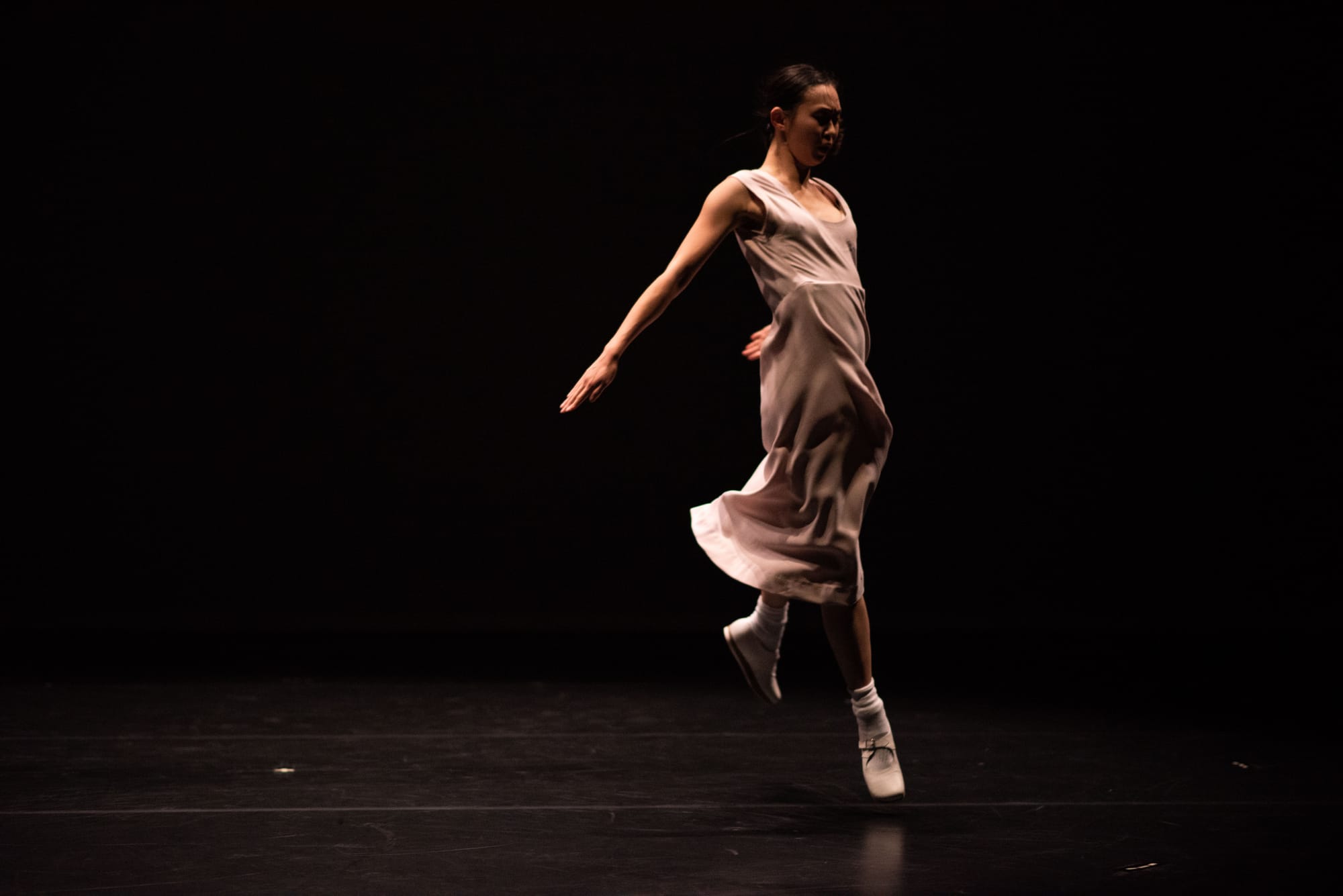 The third movement “Violin Phase,” has always been de Keers- maeker’s solo. As the choreo- grapher’s doppelgänger, Hashimoto twisted in crisp half turns, her arms bent around her waist, and her round white skirt whipping back and forth. This time, the repetitive movements built a new geometry and flow, again echoing Reich’s score. In a pattern that could also be imagined as if seen from above, Hashimoto moved in a wide circle around the stage, then cut the space into quarters, then eighths, by the shift of her movement – quick, sharp hops and arms raised above her head in repeated variations built around the pie wedges she drew with her body. Like the duets, this solo was driven not just by the violin patterns, but by momentum and will.