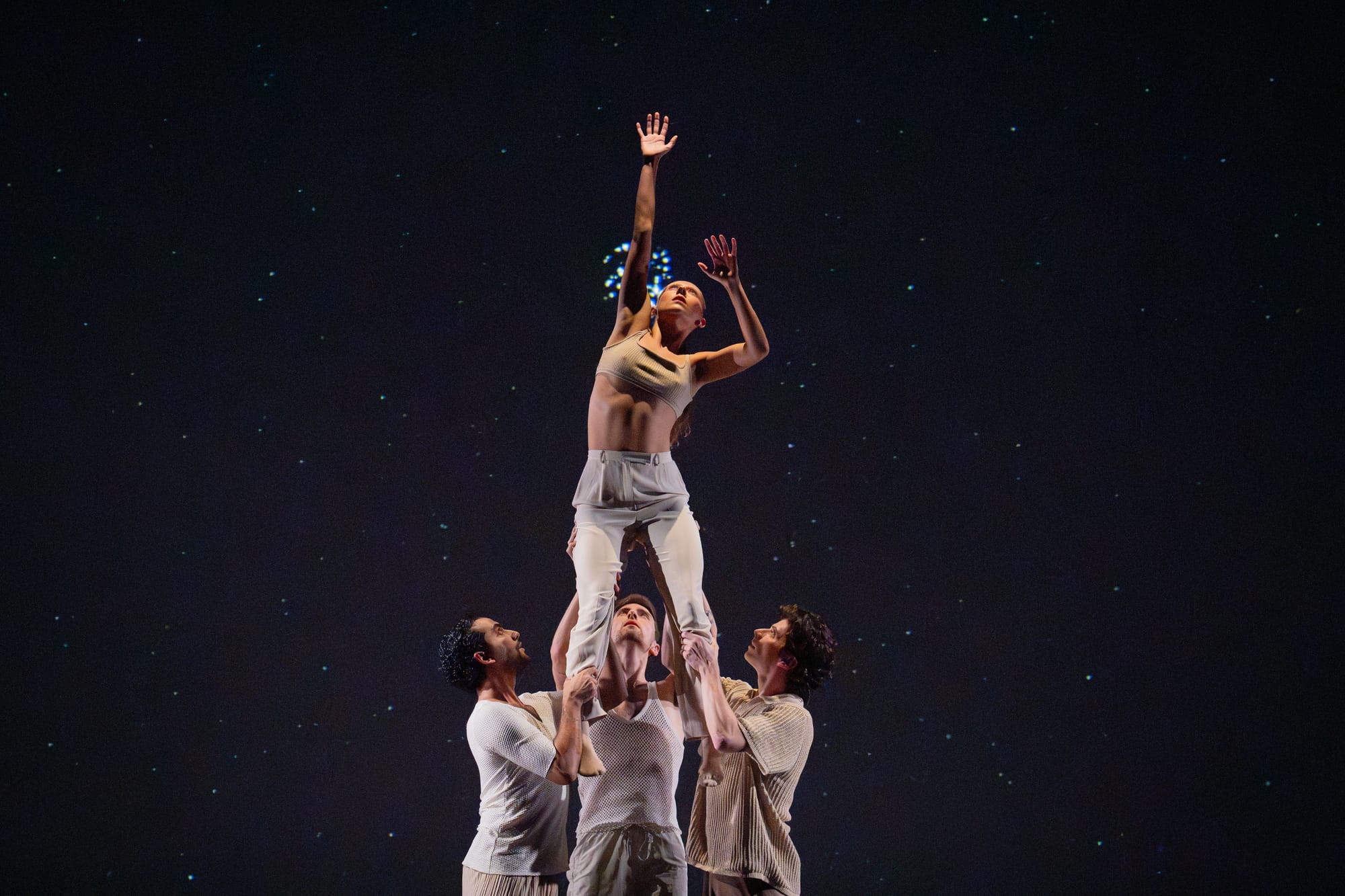 A different ballet dedicated to flora, Reisen’s “Network,” about mycorrhizal fungi and their symbiotic relationship with plant life, offered synchronized movements that at times felt primordial. The many supported lifts with dancers reaching up to the sky like sprouts or acts of prayer with almost celestial-looking graphics in the background climaxed in a silent hug for the two couples of the cast. A tender disintegration and vulnerability followed as one partner would drop down to the ground. The sadness here was more subtle.