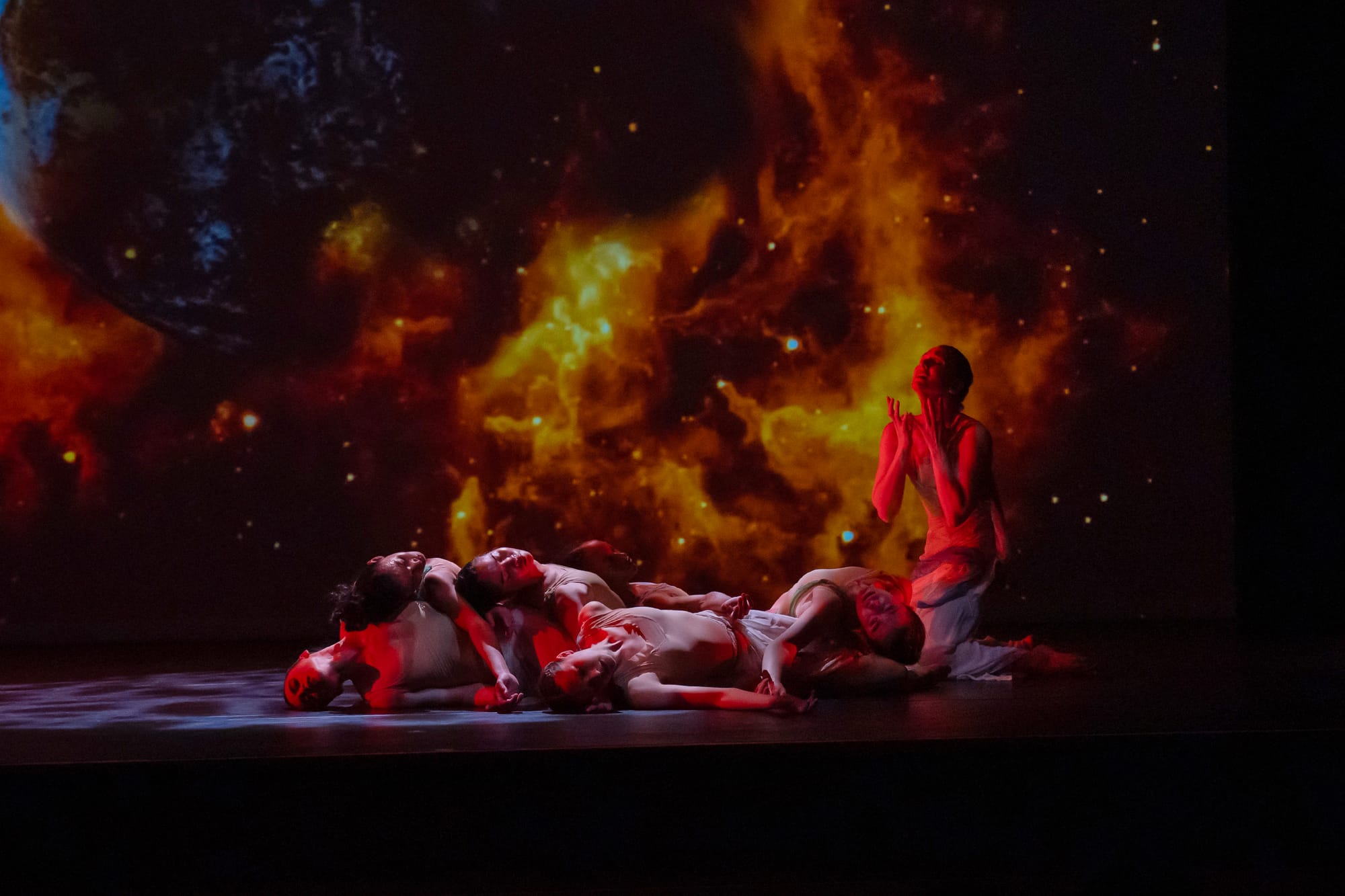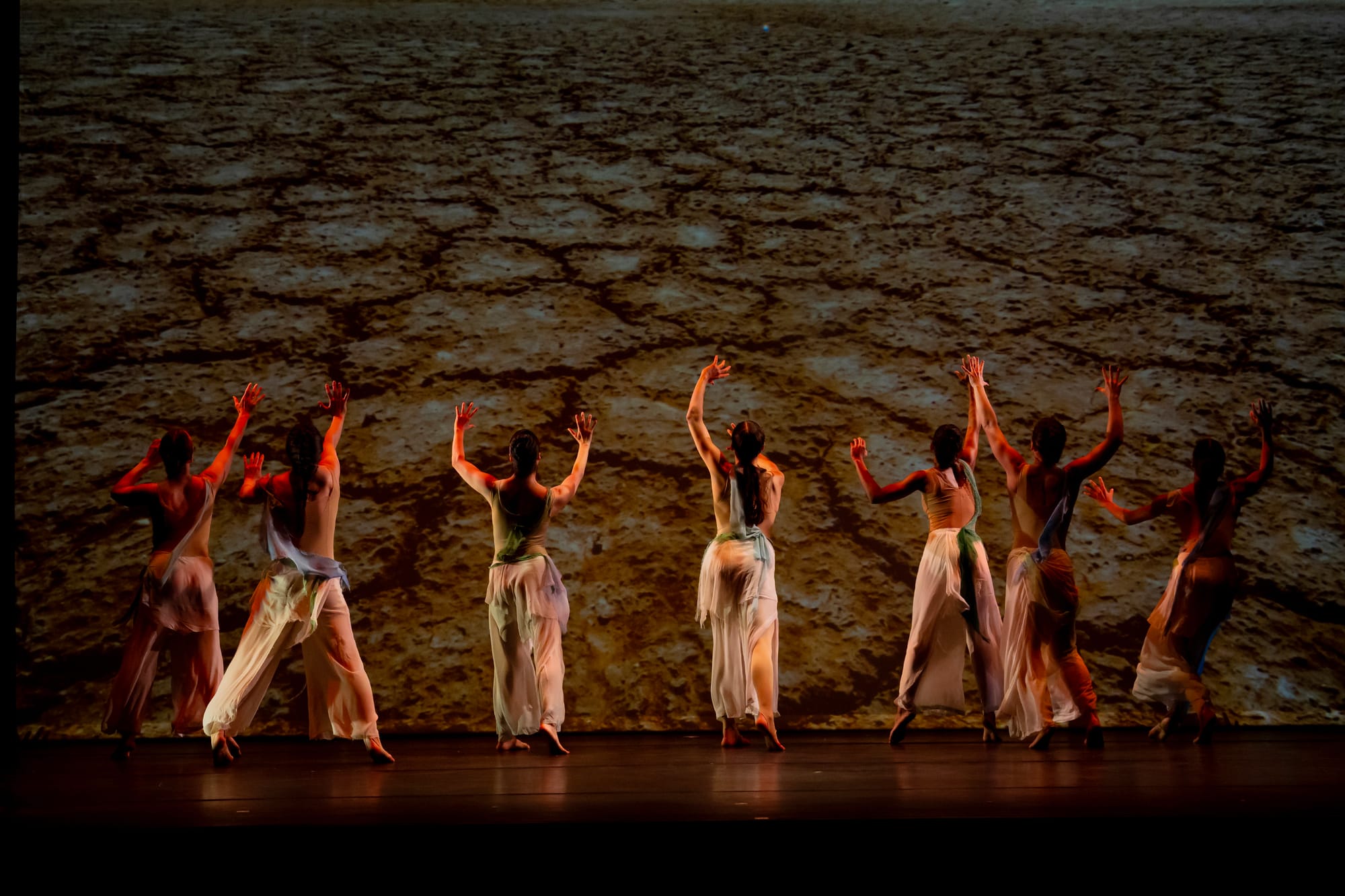 An even more heartbreaking work of the evening was among those dealing with plants. Jacqulyn Buglisi’s “Moss Anthology: Variation #5” for eight dancers with stunning projections of various images of earth – roots, moss, grass and all – was a lament for what is and what is fading. A dance full of earthiness, with crouching moves, floor spins and tapping steps, the work had an almost tactile quality to it that changed as the projected visuals took the audience to a tragic depiction of dry lands and fires.