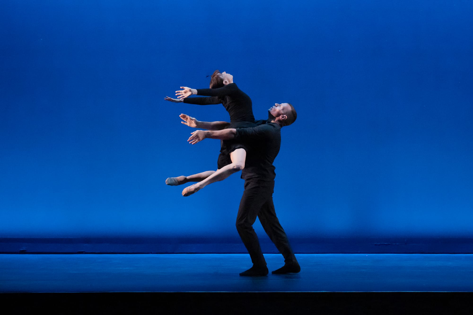 At least as represented on stage, the human reaction to this beauty and the risks it faces was not indifference. Galeazzi’s “Toujours” was a melancholy duet reflecting on loss and extinction of being. Dancing with Jason Kittelberger, the couple could not seem lonelier onstage, even if they had each other. The dance was one of interdependence, with Kittelberger supporting Galeazzi in a multitude of intricate lifts, and desperation, as in moments like where she ran and leapt to wrap her body around him, only to slide down to the ground in grief. There were no pretty graphic projections here, and the costumes were black. It was a quiet elegy.