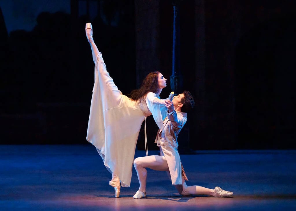 Anthony Huxley was a dignified Poet but without the sense of isolation and yearning some can give the role; he seemed confused by the Sleepwalker rather than enthralled with the vision of the unattainable Romantic ideal. This may have been in part because he seemed so happy with the Coquette (Brittany Pollack), who danced the role with a puzzling softness, as if the Poet were her true love. When he first appeared in the square, she seemed about to break into “Some Enchanted Evening” and she danced pas de deux, where the Coquette usually faces away from the Poet with a look of cold triumph, as if she were just too shy and overwhelmed to look at him. They seemed to be having a cosy little canoodle during the divertissements and she seemed broken hearted when she saw the Poet with the Sleepwalker and overcome with grief and shame at her treachery. The aura of mystery and danger, of some hidden evil in the Baron’s establishment but Maxwell’s vivid Sleepwalker showed how haunting the ballet can be.