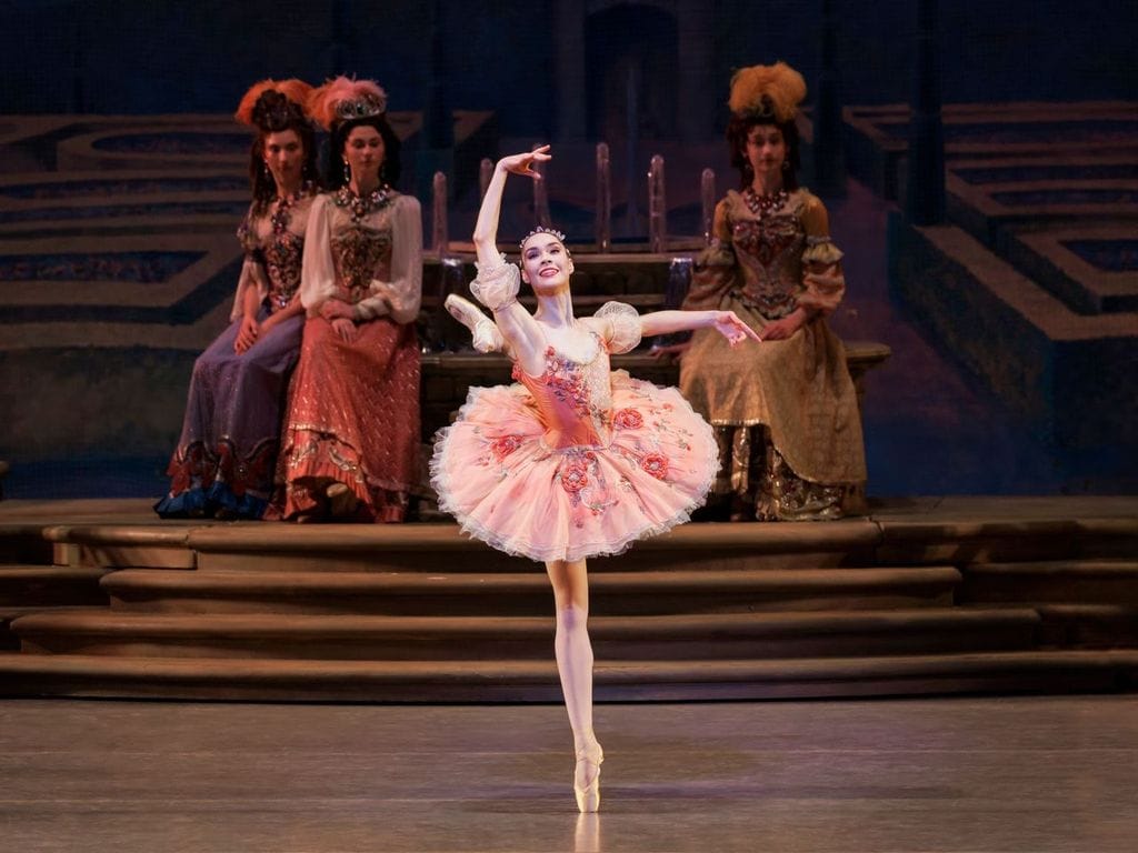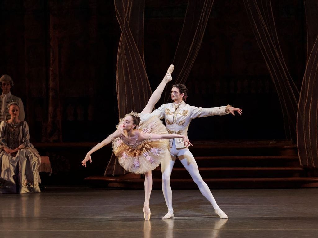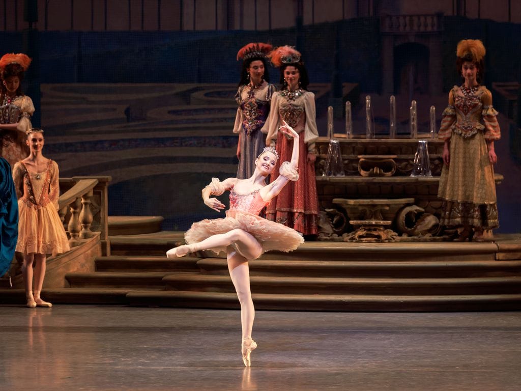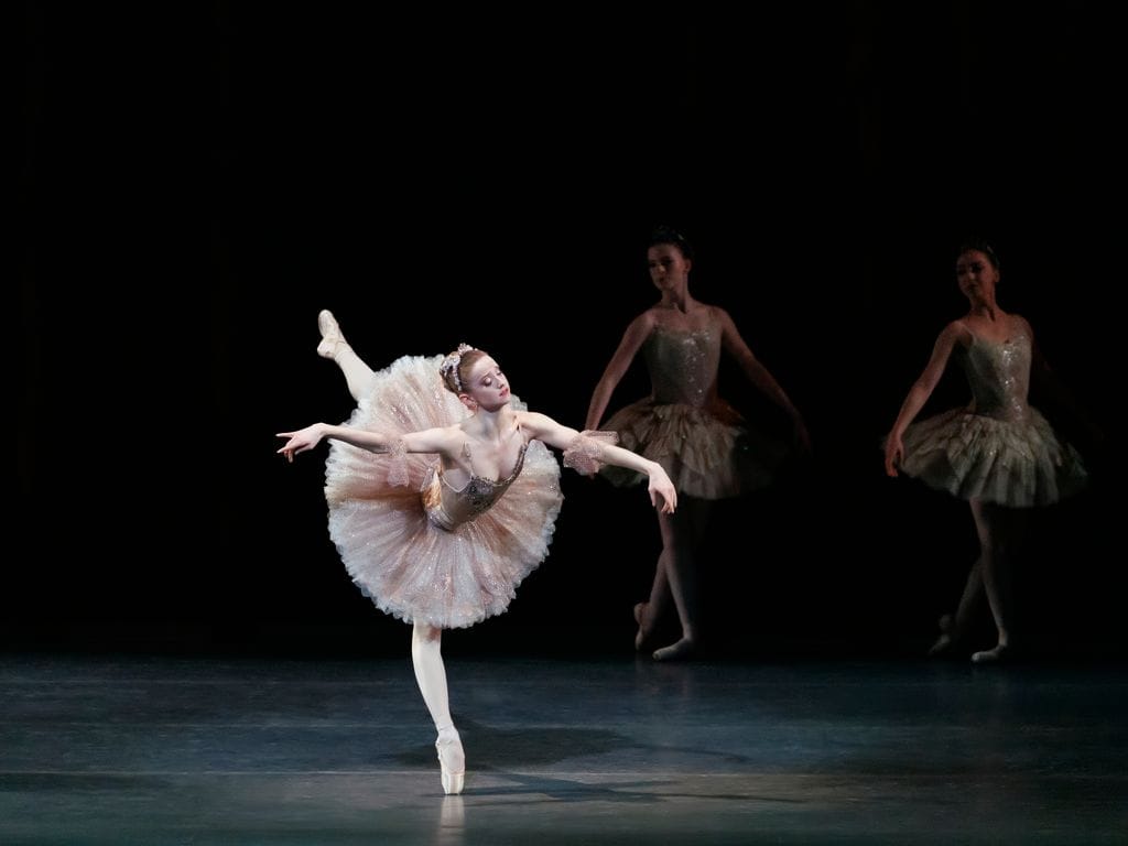 Both Kloe Walker (matinee) and Gabriella Domini (evening) danced the first fairy (Tenderness in this production) with a caressing expansiveness; Domini especially looked like she was wrapped in the music. Nieve Corrigan (matinee) was both lyrical and powerful as the fifth fairy (Courage), luxuriating in the bouncy emboîtés. Fortunately the tempos for their solos were slower this year, allowing the fairies to pause in their final poses, and they didn’t have to enter so quickly that they looked like they were elbowing the previous fairy off the stage.