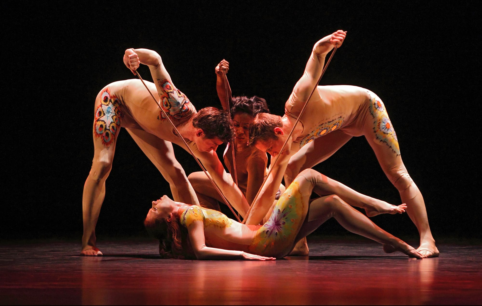 "Dust", choreographed in 1977 to the often bouncy music of Francis Poulenc's "Concert Champêtre", opened with an ominous stillness as a huge rope hung from the ceiling over the dancers posed in knotted, archaic shapes. These were overseen by a serene Madelyn Ho, and they seemed to emerge from the ground with powerful, awkward stutters, grotesque but with an odd pride. The work had an illogical nightmare quality as the focus shifted from group to group. The feeling of unease was unrelenting, as dancers fell to the ground as if stricken by some invisible disease.