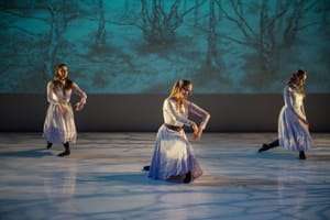 The male role, danced by Weber, was equally mysterious. Is he a friend, a foe or a love interest? Towards the end of the piece Wiles danced with him which suggested a romantic link, but that did not last, and as he left the stage for the last time he examined the four women and took two of them with him. Wiles returned to her place at the picnic blanket, looking knowingly into the distance.