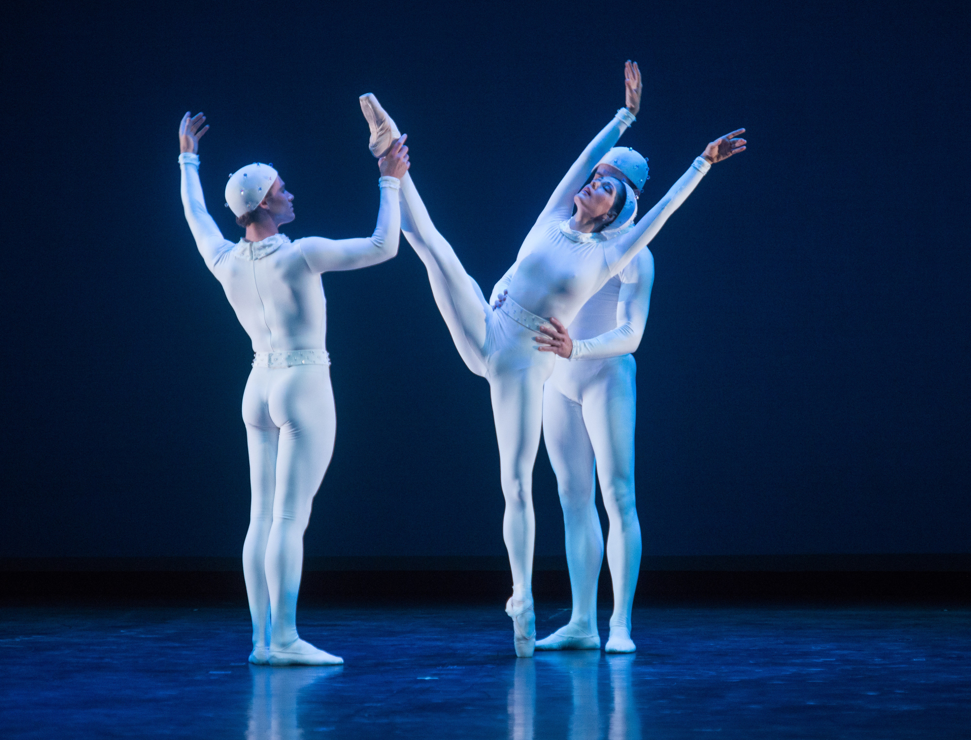 ABT and Ashton’s “Monotones II” followed after an intermission, with Cory Stearns, Thomas Forster and Veronika Part, all three of ABT’s original cast when the company had its recent premiere of this 1965 ballet last fall, doing their best to present the mesmerizing seamlessness of the ballet and Erik Satie’s “Gymnopedies” score. Unfortunately, the dancing was shaky from the very outset, with the men cautiously lifting Part from the floor for the rotation in the split position, and continued almost to the point of ruining the articulation of the lovely work with frequent stops between the dancing phrases. That lack of continuity left too much room to attune the audience to the other flaws in the dancing, such as the peculiar and vexing way in which Part would lift her foot and then return the point of her shoe to the ground, before elevating a leg in a developpé. Even if toward the end of the ballet the performance improved, particularly in the attitude turns with Part in the middle that looped Stearns and Forster standing on her sides into the motion, the overall image they presented was more human than celestial.