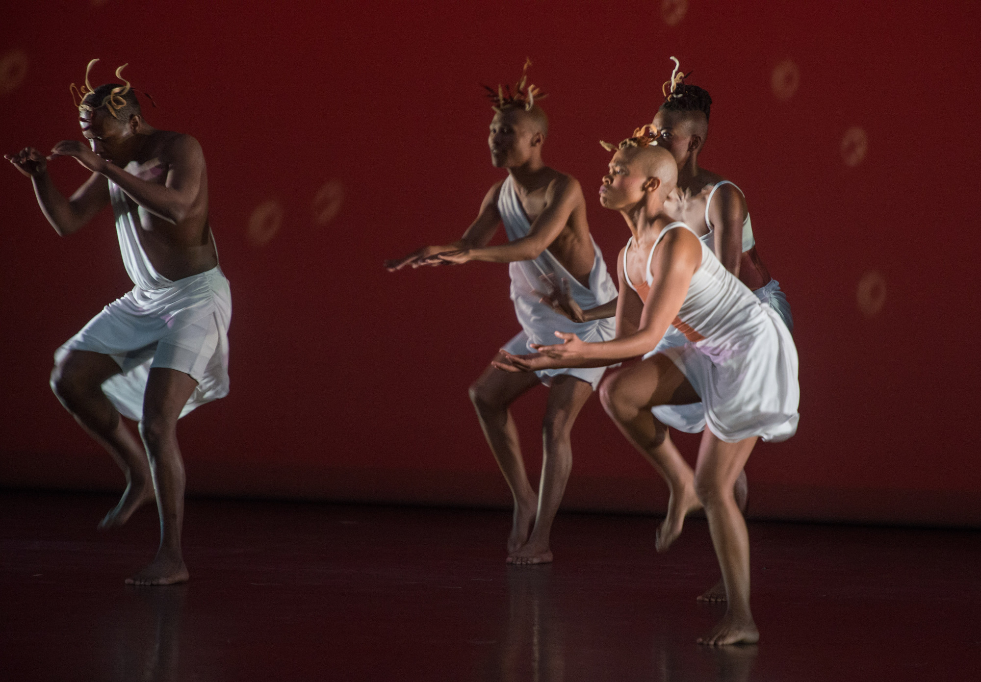 Another world premiere, Masilo’s “Spring,” was equally inventive, if in a radically different key. Inspired by African dance of the people of Botswana, Masilo’s work was largely about human sacrifice, but the theme was transmitted mostly through animalistic movements, with many jerking motions and conspicuous stillness showcased through frequent stops and poses. The somewhat Egyptian-looking tunics that the five dancers were costumed in were about the only thing that took away from the animal theme, which was set, at first, to Igor Stravinsky’s “Rite of Spring.” If the piece was to be faulted, it would be for the lingering and at a point repetitive way it tried to convey its message. By the time Stravinsky was replaced by animal and bird sounds coming through the speaker system, with Masilo’s “chosen” maiden appearing nude to repeat some of the same movement from earlier in the choreography, this otherwise shocking shift had a near anti-climactic feel. Even the beautiful way in which the synthetic sounds – essentially noise – was echoed by the equally erratic movements was almost lost to the eye after so much repetition.