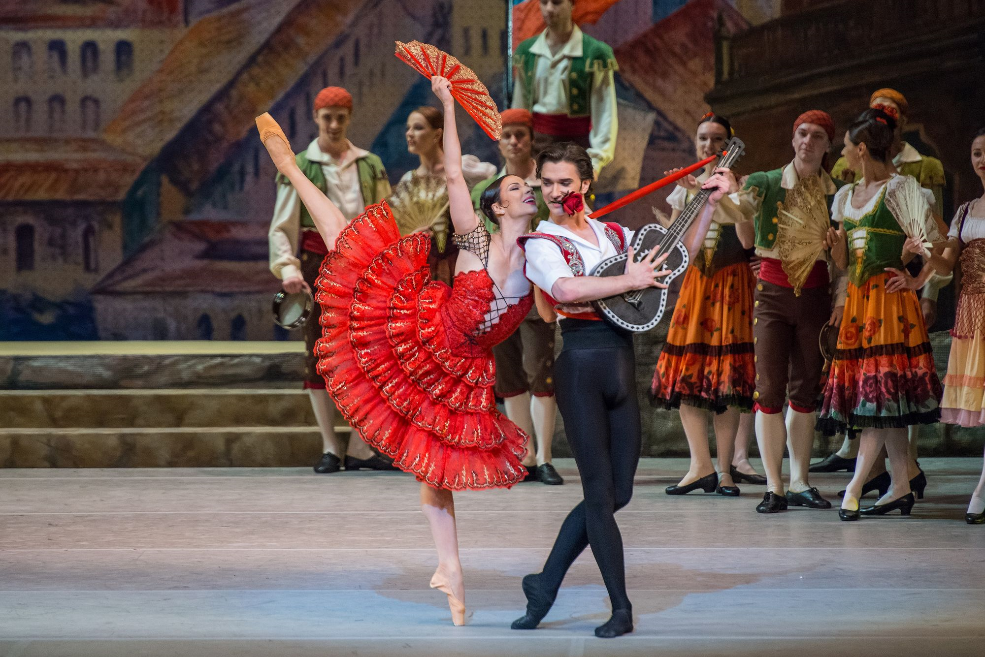 Her Basilio, Vladislav Lantratov, was completely captivated. He is somewhat slim for a Bolshoi dancer and at times seemed a bit overwhelmed by Alexandrova's burst of energy, but he has an appealing charm, somewhat reminiscent of Angel Corella's, and his dancing was clean and sharp, and his mime clear. The Bolshoi's fake suicide takes place in the second act, almost as a throw away amidst a lot of Spanish swishing in that very crowded tavern, so the love story is somewhat downplayed, but any Kitri would be happy with his Basilio.