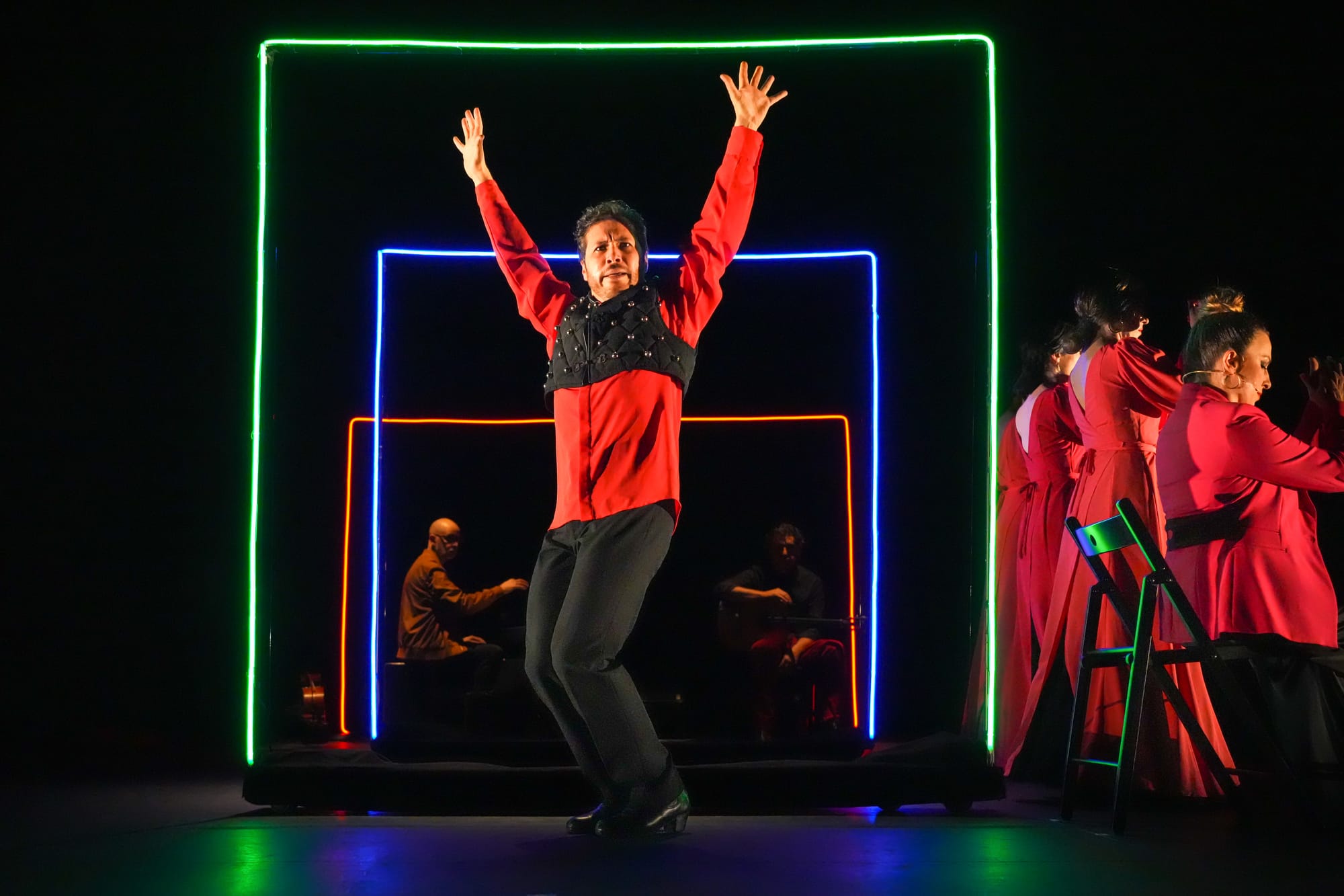 Although not expressly about any particular narrative, the strength of “Equilibrio” was precisely in its ability to show so much in so little time, in large part thanks to the staging and the use of many traditional and novel props. For the set décor, the company utilized three neon-lit frames, which the dancers manipulated to add dimension and help conjure up sceneries, but also frame the dancing. Early in the performance, these frames were positioned with a square effect, making it look like a room where Ochando danced one of the most interesting solos of the evening. Beginning on his back with movement limited to castanet playing, he slowly rose, and the impression was of a man confined in a room (perhaps, during the pandemic’s quarantine), the rhythms his hands produced being the sole form of expression of what was a vibrant range of emotion. In a conversation after the performance Ochando mentioned that this was his take on castanet orchestral performances, where the castanets are the central instrument, but the staging gave it much more meaning.