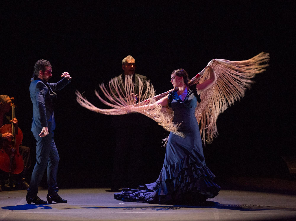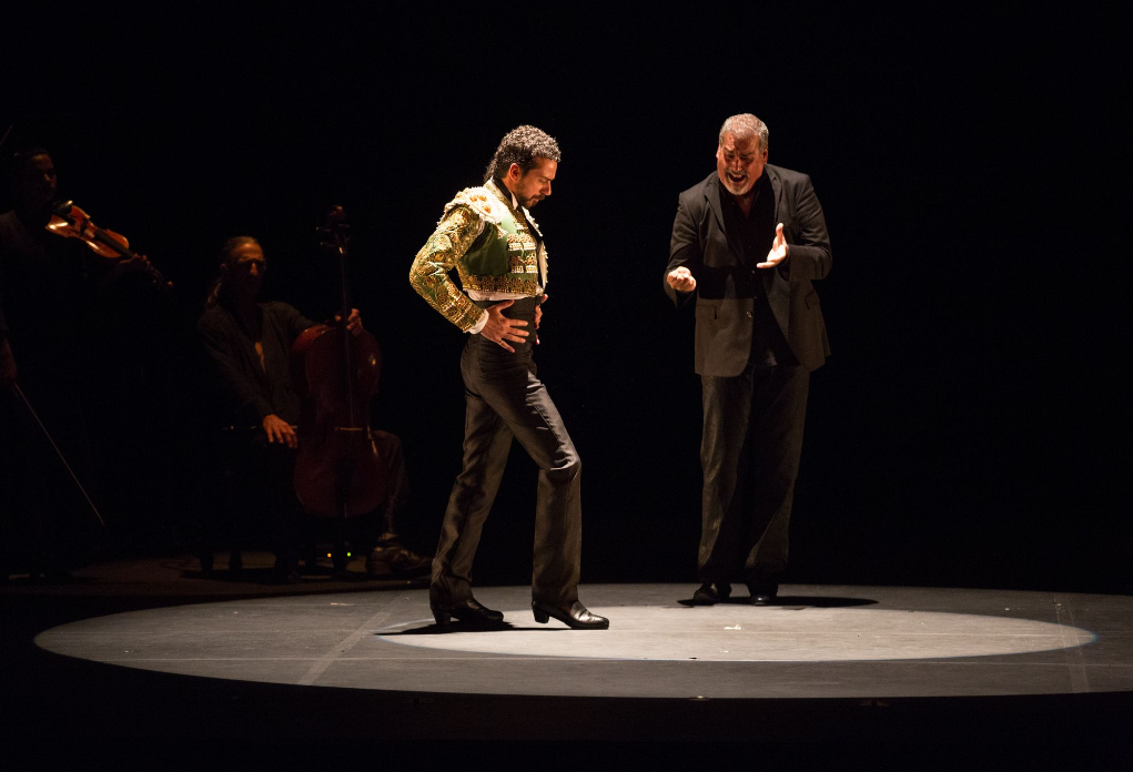 The highlight of the night however was an even more traditional piece presented toward the end of the program called “Soleá” in which Siddi took the stage for an impressively long and stamina-testing solo. Performing in a matador-like costume, he himself often resembled a torero, taunting the rhythm of his dancing, and using it to overpower and tame the music of his traditional and classical musicians. His dancing was powerful, richly laced with varied emotion, and it wasn’t all skill either. There was more embellishment than one would expect from a male dancer, more use of hands and hips. Still, this expressiveness and technique was overshadowed by the sheer stamina of his dancing. I could not recall a flamenco dancer being able to stay on stage and sustain powerful performance for as long as Siddi did in his number, time and time again forcing the question with his dancing: just how much can he extract from the music and the steps? And time and time again answering: so much more.