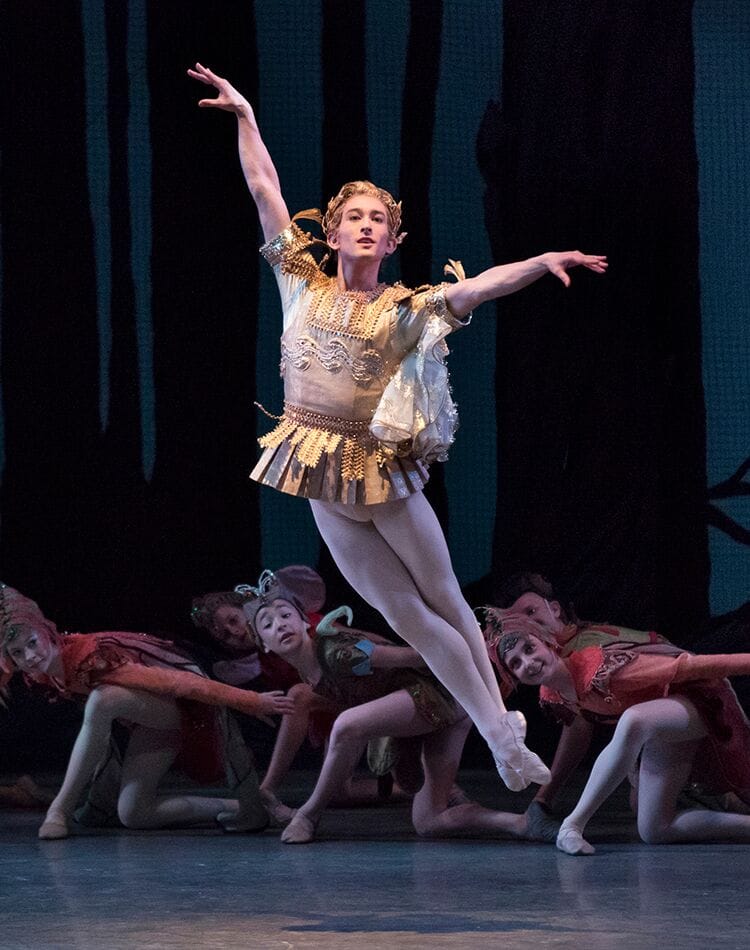 Huxley's Oberon had a regal power; the golden wig certainly helped give him an extra brightness but his firm, powerful, commanding mime, elegant upper body, and extraor- dinarily clear dancing (all those seemingly effortless beats seemed to gain power as he crossed the stage) deserved the crown. His royal dignity (even while seeming to float over the ground) was a wonderful contrast to Mejia's eager, mischievous Puck. Mejia is a real stage animal, absorbed in the story, reacting to everything around him; he is a generous performer who can make the stage brighter, not just by his dancing (which is breathtaking) but by his warmth.