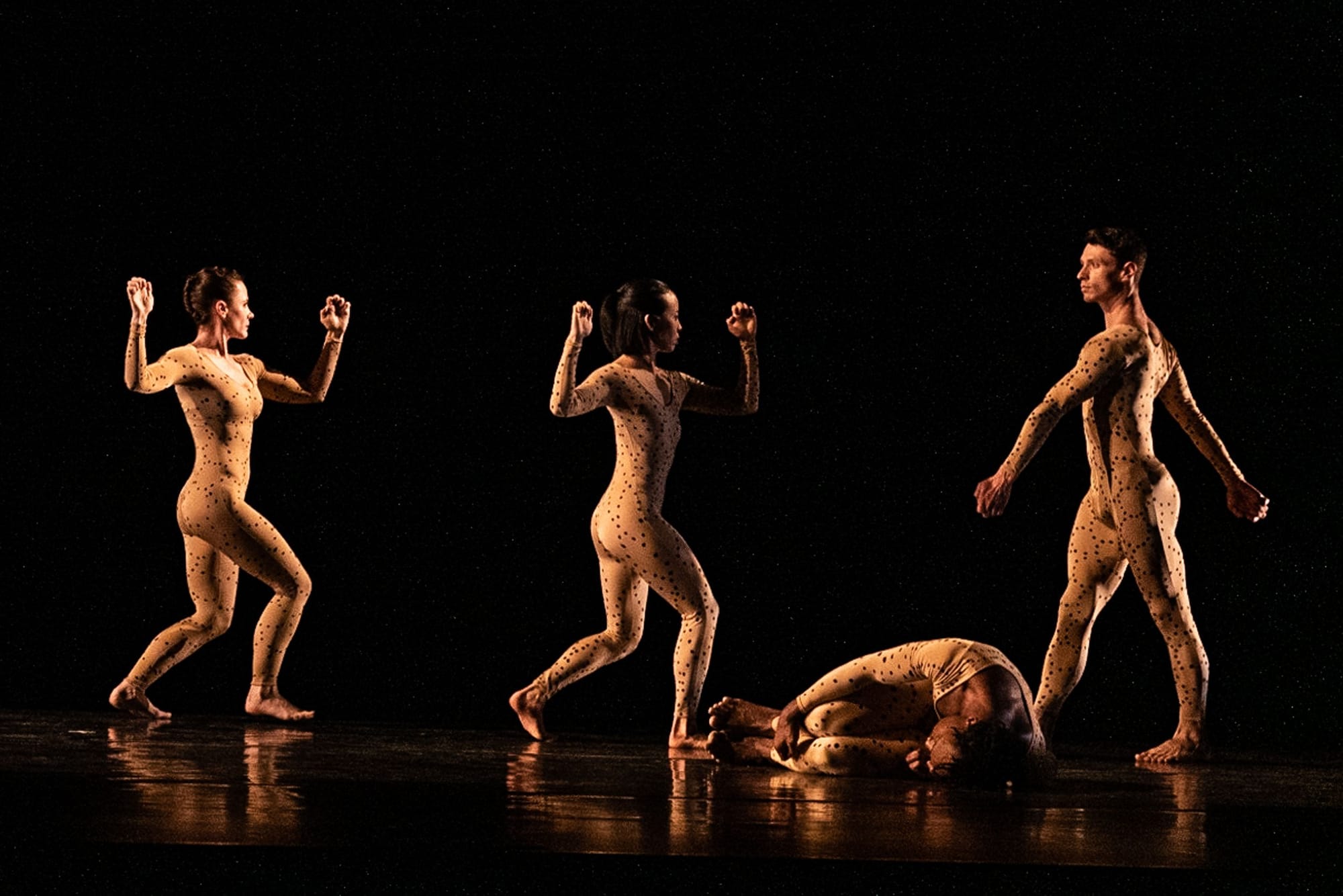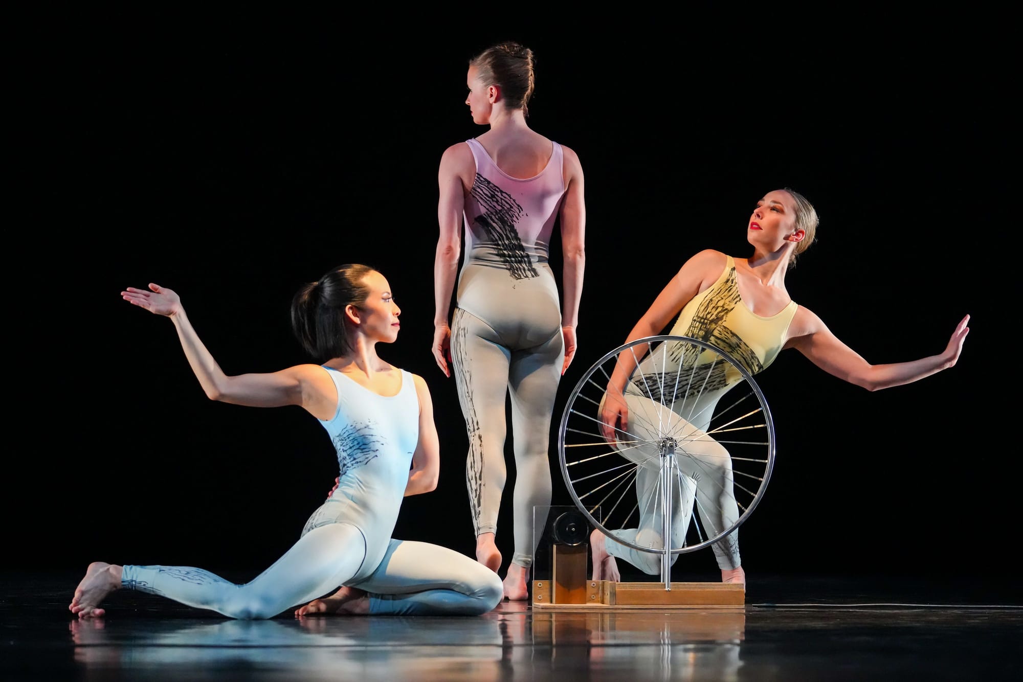 "Tracer" (1962), designed by Rauschenberg, had another prominent prop, a wheel which would spin seemingly at random (and which is an echo of Marcel Duchamp's 1913 wheel), and another modernist composer, James Tenney. The four dancers (Lee Duveneck, Madelyn Ho, Kristin Draucker, and Jessica Ferretti) danced in bursts, alternating between balances and shards of movement, with an intense concentration and a hint of emotion (at one point Duveneck and Ho tentatively hold hands).
