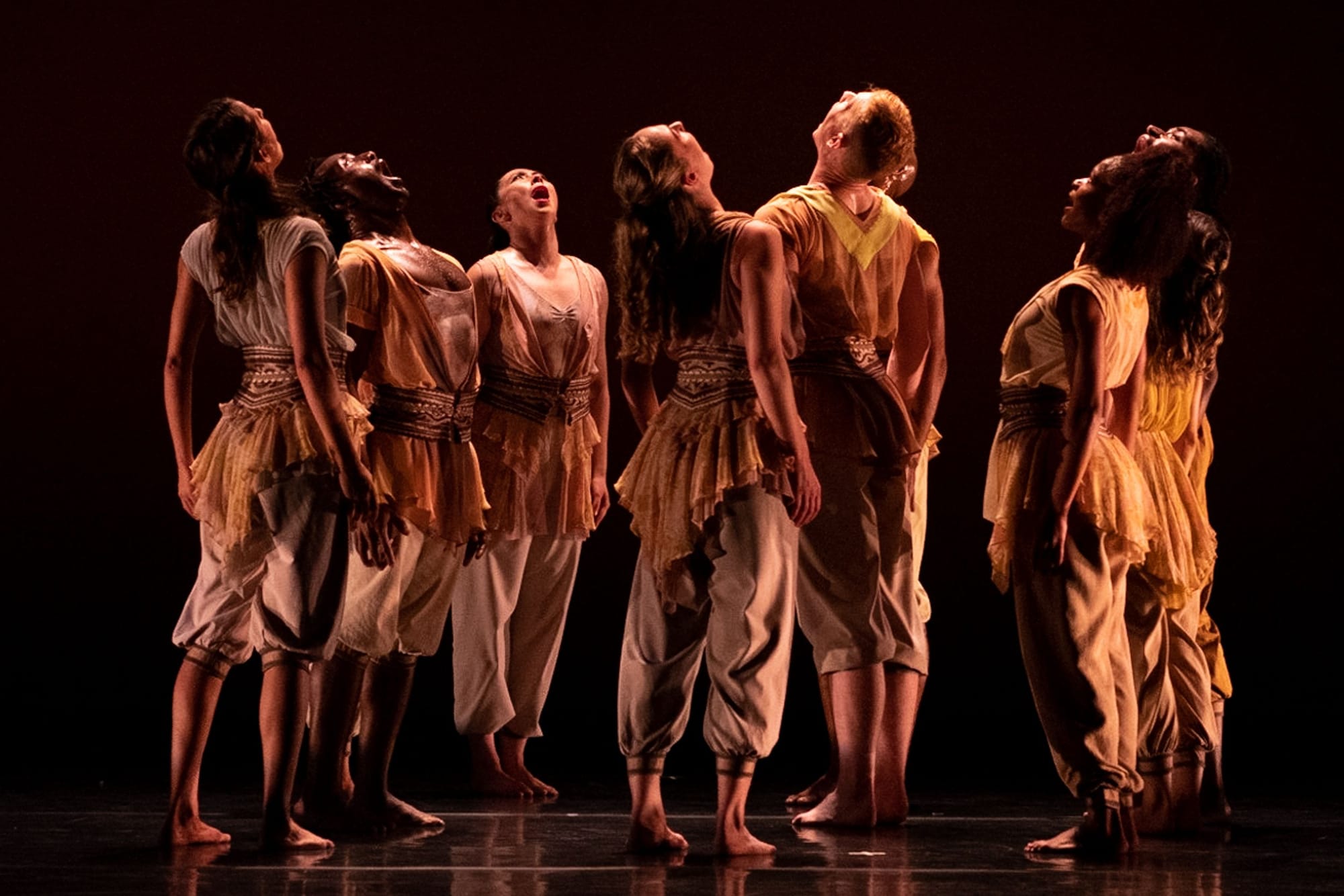 Of the five dancers, Austin Kelly stood out for his effervescent joy and smooth, weighted jumps as he bounded through his difficult choreography, leaping up from his deep plies into bouncing sideways jumps and looking very happy doing so. Jada Pearman, too, danced with a luscious lilt and lit up the stage. For all the joy in "Aureole" there are shadows too. The famous male solo, originally danced by Taylor, with its long, stretched line and precarious balances, is a private moment separate from the buoyant crowd. Lee Duveneck (June 18 matinee) and Devon Louis (June 17) both performed with a steady flow, making the shifting shapes look easy, though Louis, for all his height, is a much lighter dancer than the traditional Taylor type. And both dancers were stoic and reserved, so the piercing, aching, and exposed heart of the solo was missing.