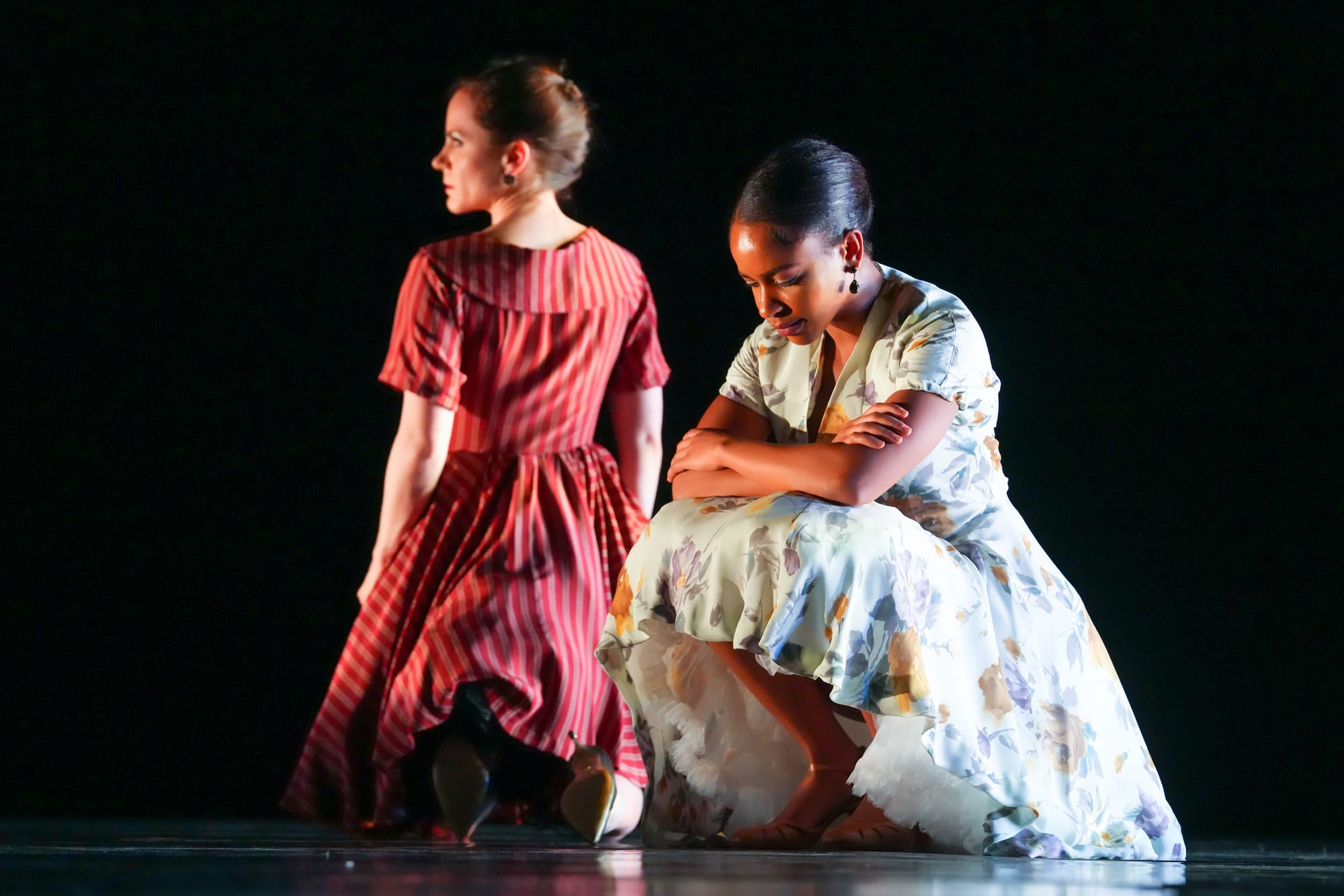 The earliest work performed was "Events II", from 1957, which was originally part of the famous, or notorious, first full evening of Taylor's works where Taylor, to a rapidly diminishing audience, explored movement, or rather lack of movement, as an expressive form. "Events II", set to the sound of pounding rain and performed (one cannot say "danced") by two women, Eran Bugge and Jada Pearman, had the haunting ambiguity of an Edward Hopper painting. The two women, in 1950s dresses, appeared to be waiting for something or someone, and occasionally shifted positions or folded their arms. Nothing else happened. The end. But somehow the dancers created such a vivid image that these two women seem alive to me, waiting still.