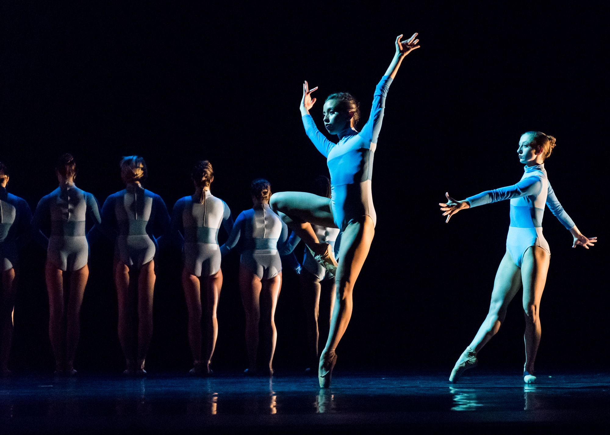 Eryn Renee Young’s futuristic looking "Anodynia" was intended to explore the strength and weaknesses of the female condition, and had a discernible primal quality to it. Yet the poorly fitted skirted-leotard costumes on the less-than-fit dancers took away from the full impact that the piece's dramatic pauses and distorted positioning could have achieved with more athletic and controlled performance. Jen McGinn’s “Through the Dust,” set to an impressive array of music from Chopin to Daft Punk and Drake, was promising from the start, and its translation of hip-hop and jazz movements to pointe work had an air of freshness to it. Though again, the piece, performed by dancers that came in all shapes and sizes donning futuristic leotards, likely would have revealed more of itself with a different cast.