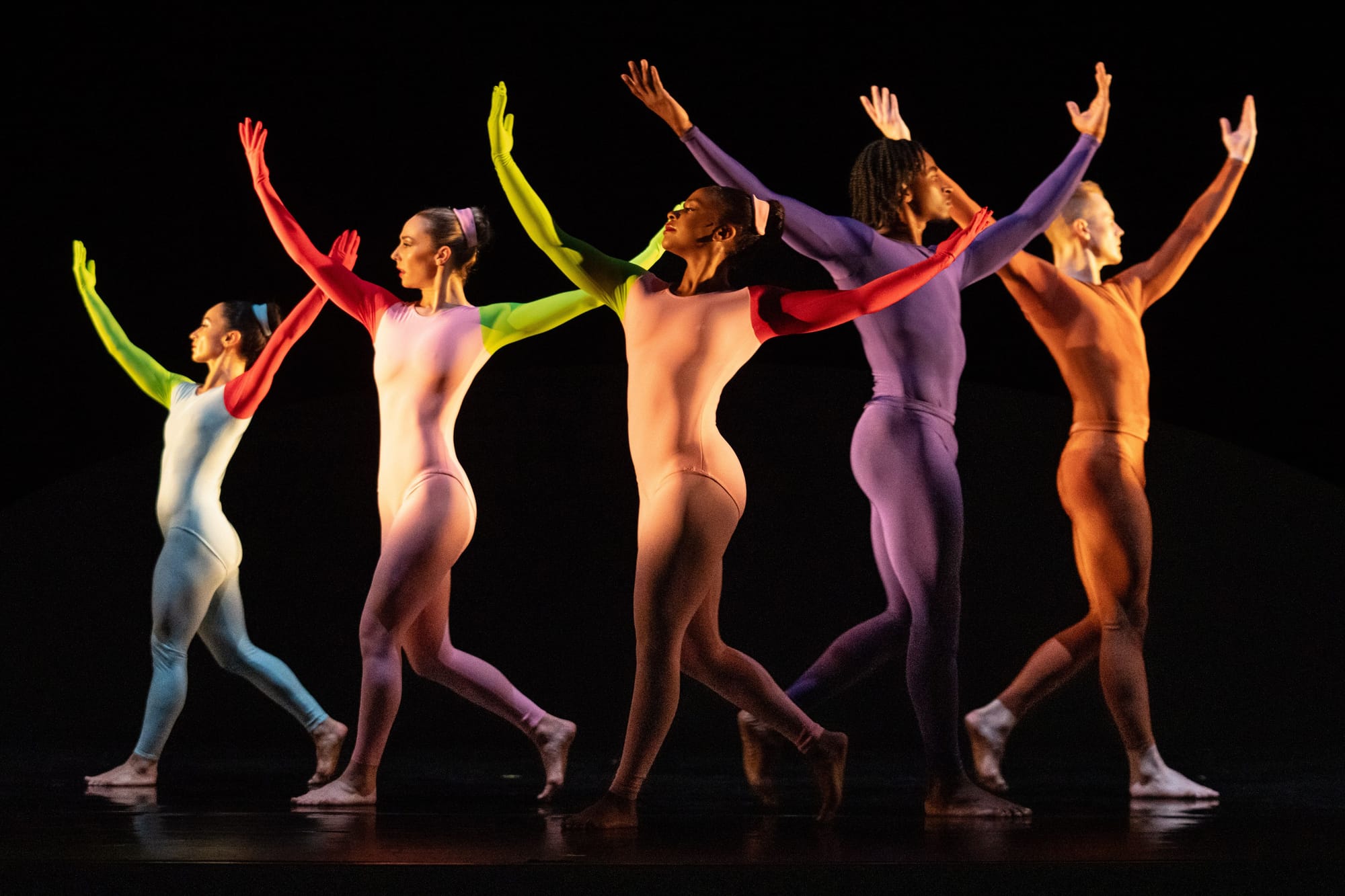 “Post Meridian” also has its inscrutable moments and its spell may not be as powerful, but the work, revived in 2019 after a 30 year hiatus, is a fascinating glimpse of Taylor’s early experiments. The music (some might question that appellation) was commissioned from Evelyn Lohoefer de Boeck, and is an apparently random collection of bizarre sounds reproduced on magnetic tape. It opened to the sounds of what may be a thunderstorm, as two women (Bugge and Lisa Borres) walking across the stage, in pastel unitards with long gloves, one green and one red and hints of decorous pill box hats. (Alex Katz designed the eye-catching costumes.)