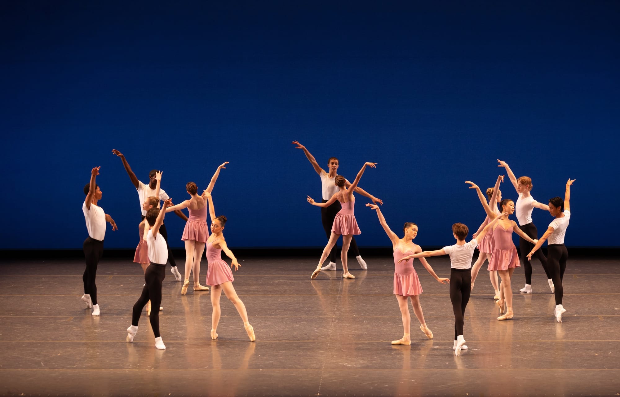 There was more Glazounov in the brief excerpt from “Cortège Hongrois”, another of Balanchine’s “Raymonda” reworkings. The ballet was made in 1973 for Melissa Hayden’s retirement and is basically a confection of classical and character dancing evoking the original ballet’s grand finale. The eight couples, in costumes by Rouben Ter-Arutunian borrowed from the main company, danced a stylish classical parade with elegant hints of character dancing. (The original finale was meant to celebrate King Andrew II of Hungary, who was a guest at the happy couple’s wedding—Petipa did love an excuse to add some character flair to his choreography.) The SAB couples danced with a hearty precision, tossing their heads and snapping them in unison; they, and Aesha Ash, their stager, seemed to relish the little character details. There was one slight mishap as one of the dancers fell, but she continued with unfazed aplomb.
