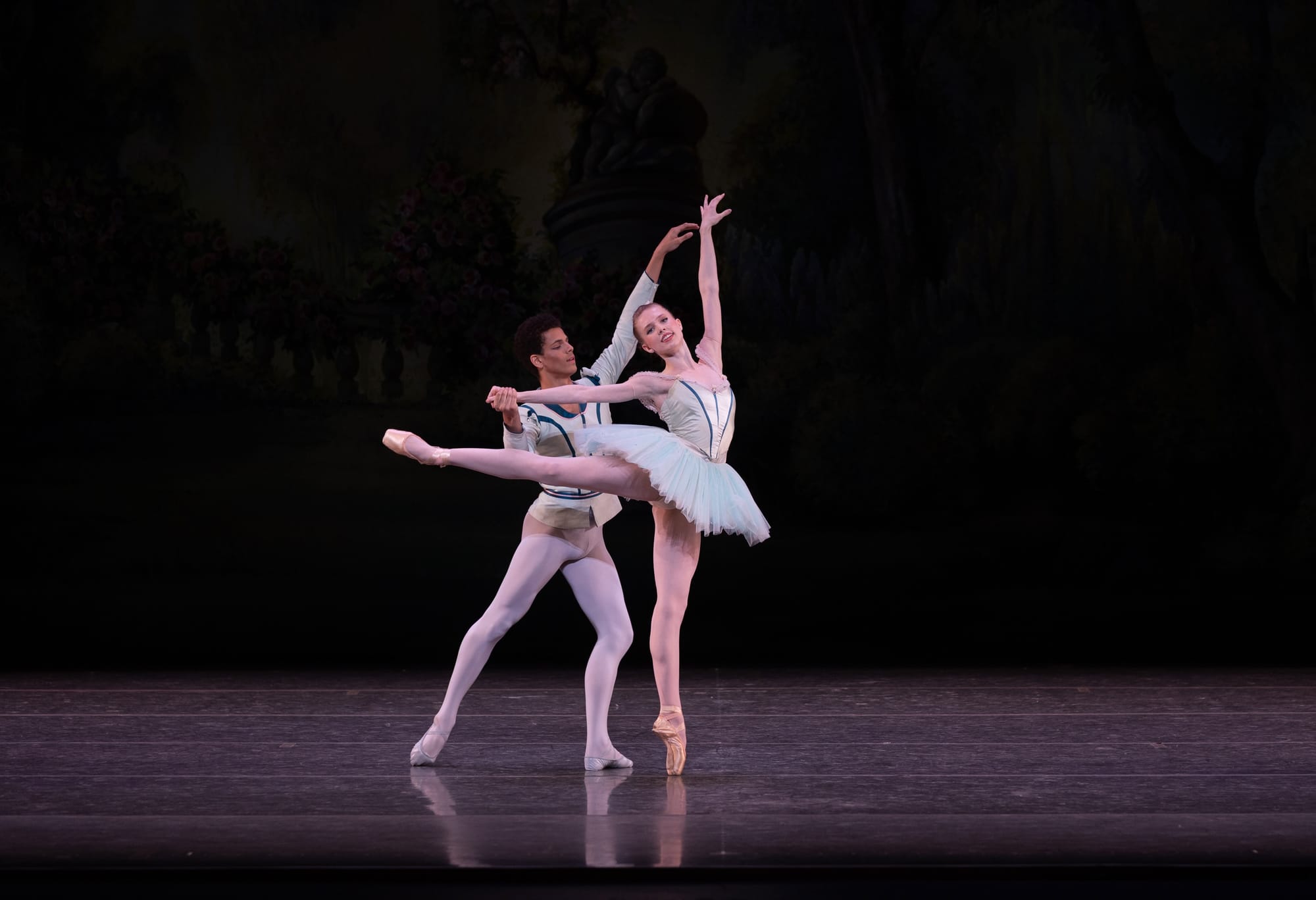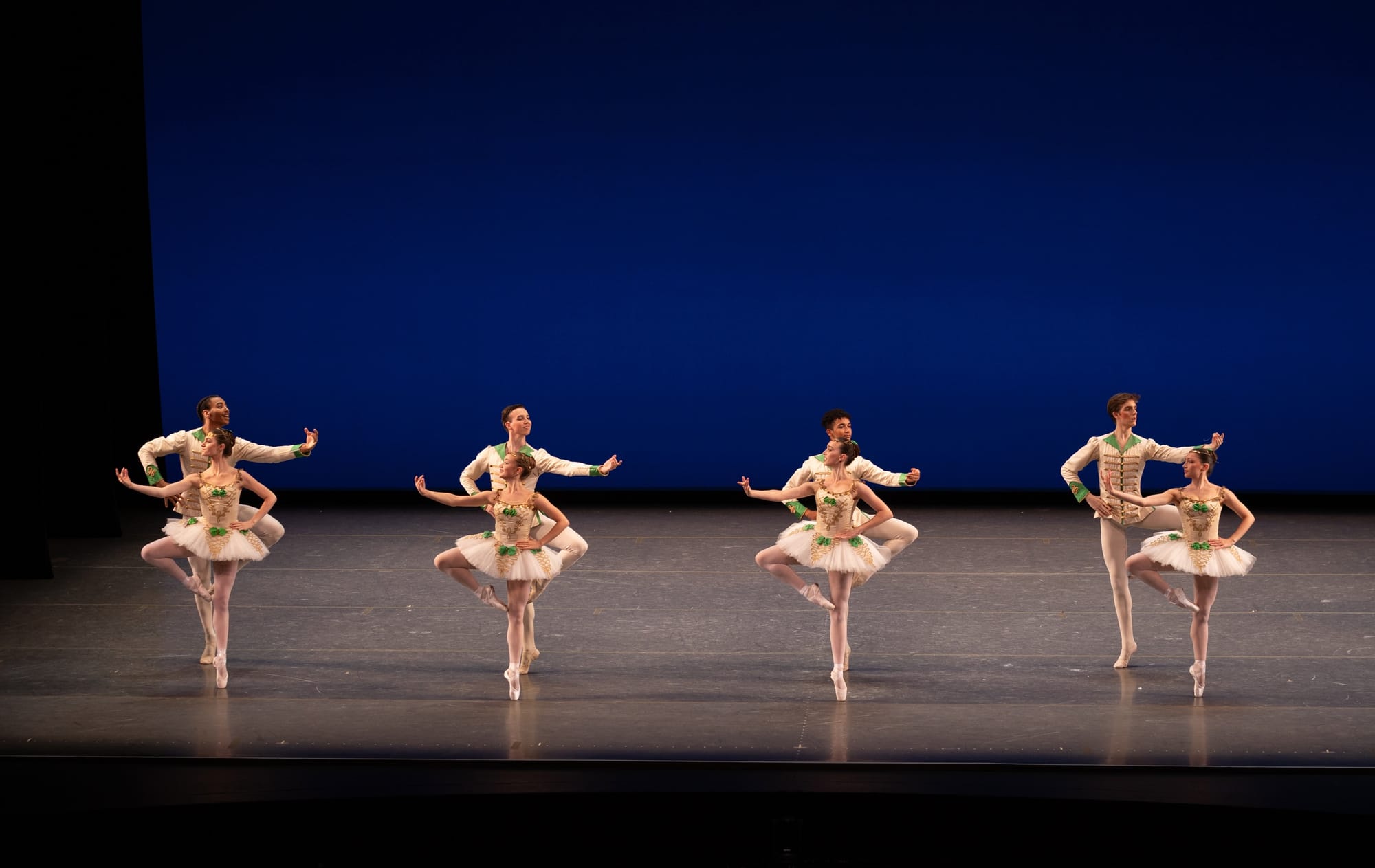 The other female soloists danced with a notable confidence, especially Tuscany Bramwell in the first variation, with those traveling hops on point and Kennedy Sullivan in the third solo, where her arms seemed to ripple through the harp music, catching the quick changes of direction. The corps too all looked like they were having a wonderful time, dancing with elegant precision and relaxed upper bodies; it was staged by Suki Shorer who received a well deserved round of applause.