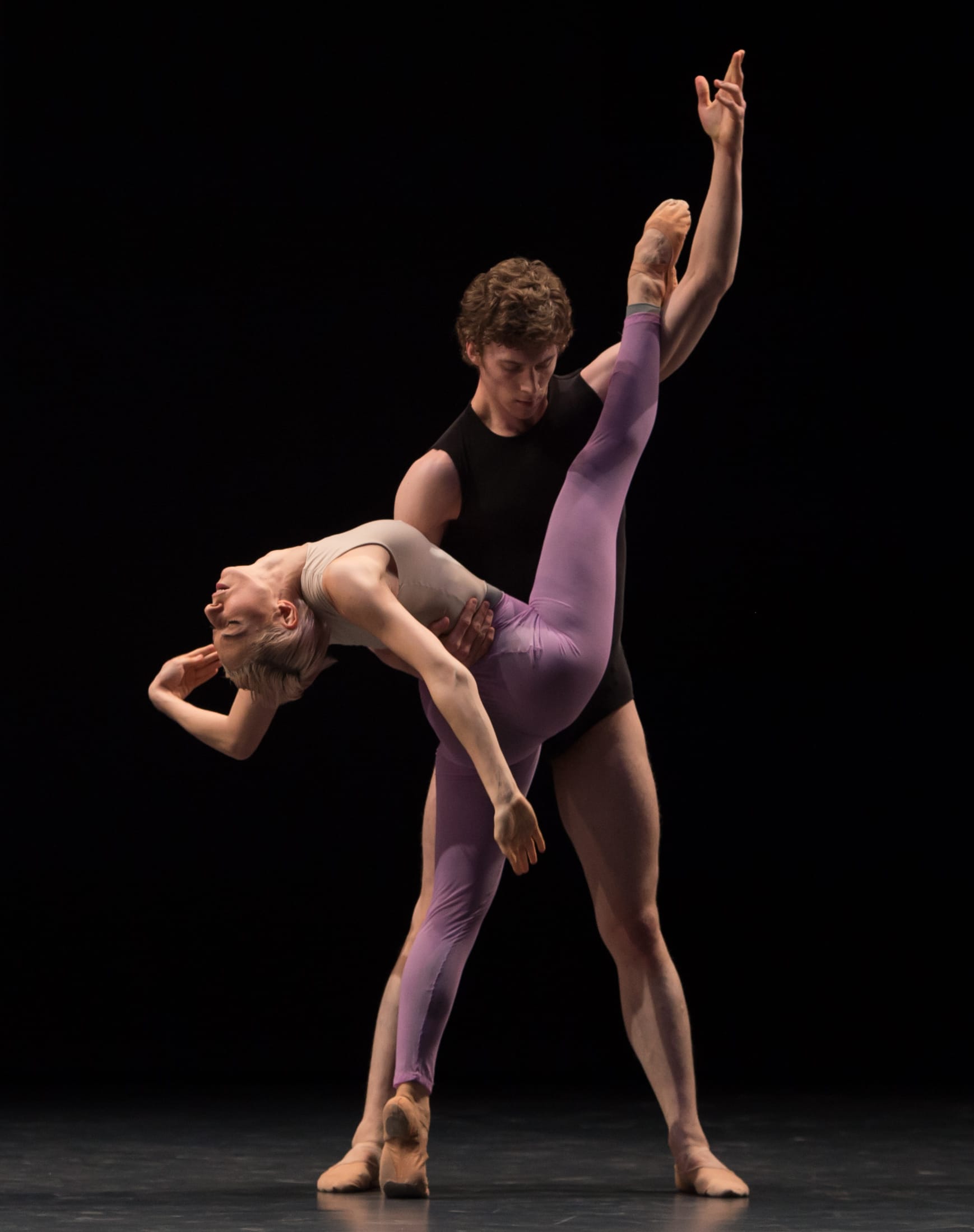 The jagged and somewhat uncomfortable juxtaposition of the music’s abrupt chords with the singing of the poem gave the work an abstract feel, both capturing and highlighting the awkwardness of the depicted interactions. The dancing, with its many lifts (often in splits), intertwinements and body releases, with the dancers periodically slumping in each other’s arms like rag dolls, displayed a closeness without intimacy, and a physical interaction with singular resolve and little warmth. The ballet was both humorous and sad in its emotionally divorced interfacing, with the words of the song frequently coming to aid in making sense of it all, until the dancers’ ultimate release from the situation where they pirouetted offstage in different directions.
