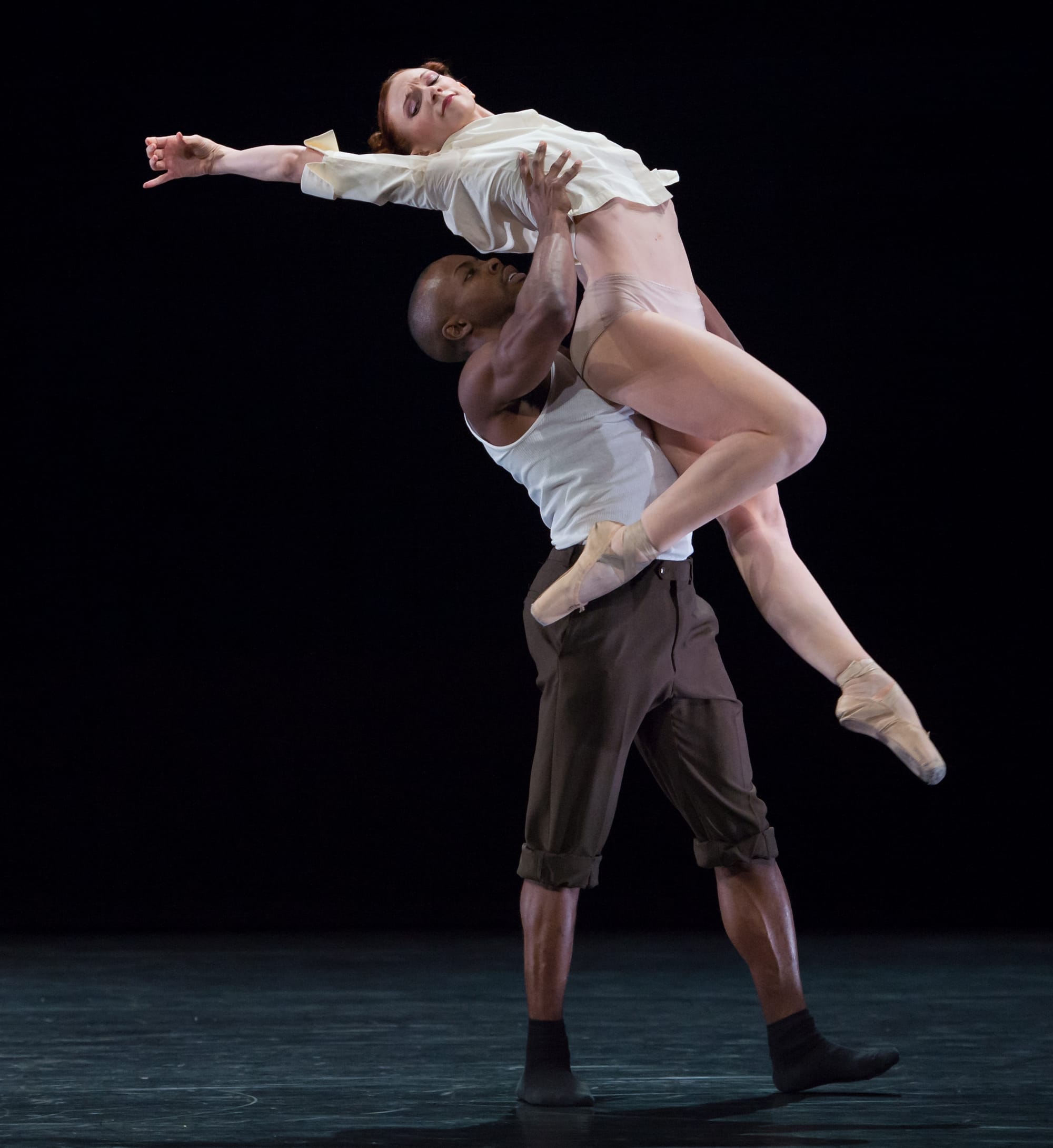 Alexander Whitley’s 2014 ballet “The Grit in the Oyster,” to “Piano Quintet,” followed, and set itself up to appear as intriguing as its title suggested. Three dancers, Natalie Allen, Antonette Dayrit and Wayne Parsons, dressed in contemporary multicolored clothing, interacted throughout the ballet, dancing alternatively alone, all together, and partnered in short duets with the third dancer watching. The architecture of the choreography was varied, at times filling the music with nuanced and energetic movement, at other times locking the dancers in interconnected poses and letting the music play on – ceding center stage to the sound. There was a recurring move that tied the work together, a grand rond de jambe in which the body then followed the leg’s trajectory, turning and then collapsing to the floor or continuing under the outstretched arms of a partner, thus breaking or reforging partnerships. Its overall effect and the choreography as a whole resembled morphing play-dough, with the dancers’ dynamic and shapes looking composed in one moment, disintegrated in the next, and then formed into something different. The interactions maintained a discernible tension between cohesion and counter-position, but ultimately not enough to produce their pearl.