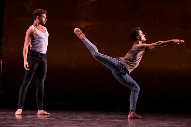 "The Last Time This Ended", a premiere, was another pas de deux danced by Prottas and Stanley, in jeans and t-shirts (no princes here). The "source art" as the program called it, was a series of photographs of grass and flowers by Dafy Hagai. The work had a faintly elegiac quality as it ended with Stanley walking slowly away while looking back. They may have been two lovers or two friends; the relationship was not explicit. What was explicit was the quality of the dancing. Stanley could make tying his shoes seem profound and his loose-limbed intensity gave his dancing both power and vulnerability. Prottas was huskier but equally fluid.