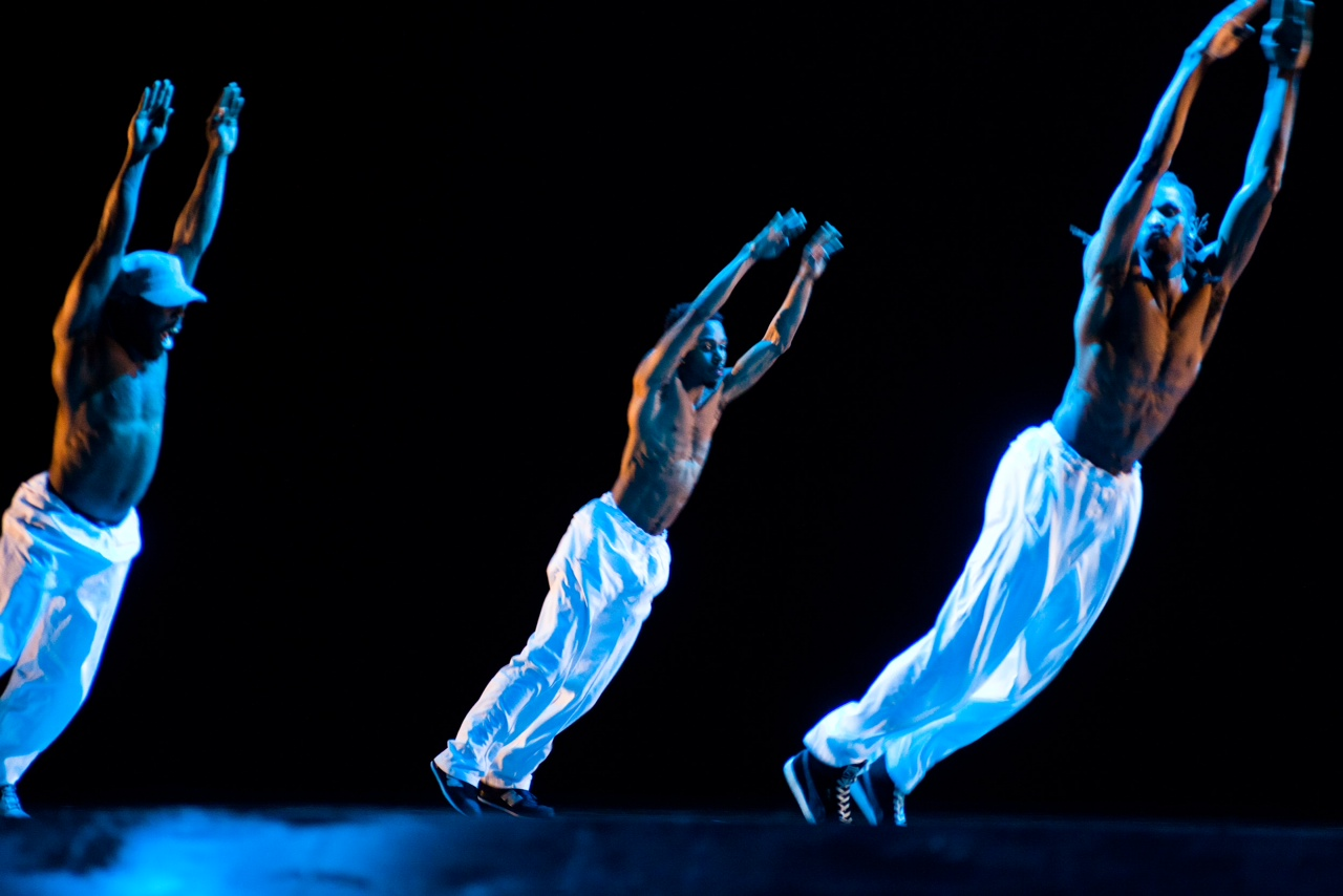 The final work, Rennie Harris’s 1993 “Students of the Asphalt Jungle,” opened to a drum beat and a piece of Dr. Martin Luther King Jr.’s famous “I Have A Dream” speech. The dancers, bare-chested and wearing only white cargo pants and sneakers, walked onstage, passing each other, then embraced. The music’s energy shifted, stirring a kaleidoscopic display of an electrifying mix of hip-hop, break dancing, and homages to other dancing styles, complete with jazz moves, tap moves, shoulder popping and every b-boy acrobatic flip, spin, balance and slide (including a head-slide!) you could imagine. The crowd ate it up, but the work was not just about showmanship. Inspired by African dances (though not relying on that specific vocabulary) the piece celebrated the African roots of the many dance styles prominent today, and with its pure joy of dancing made the audience feel part of it. When the dancing ended, the eight performers of Rennie Harris Puremovement only reinforced that sense of unity by leading the standing audience that didn’t want them to leave in a rhythmic clap, thanking the crowd for their ovation and holding up peace signs.