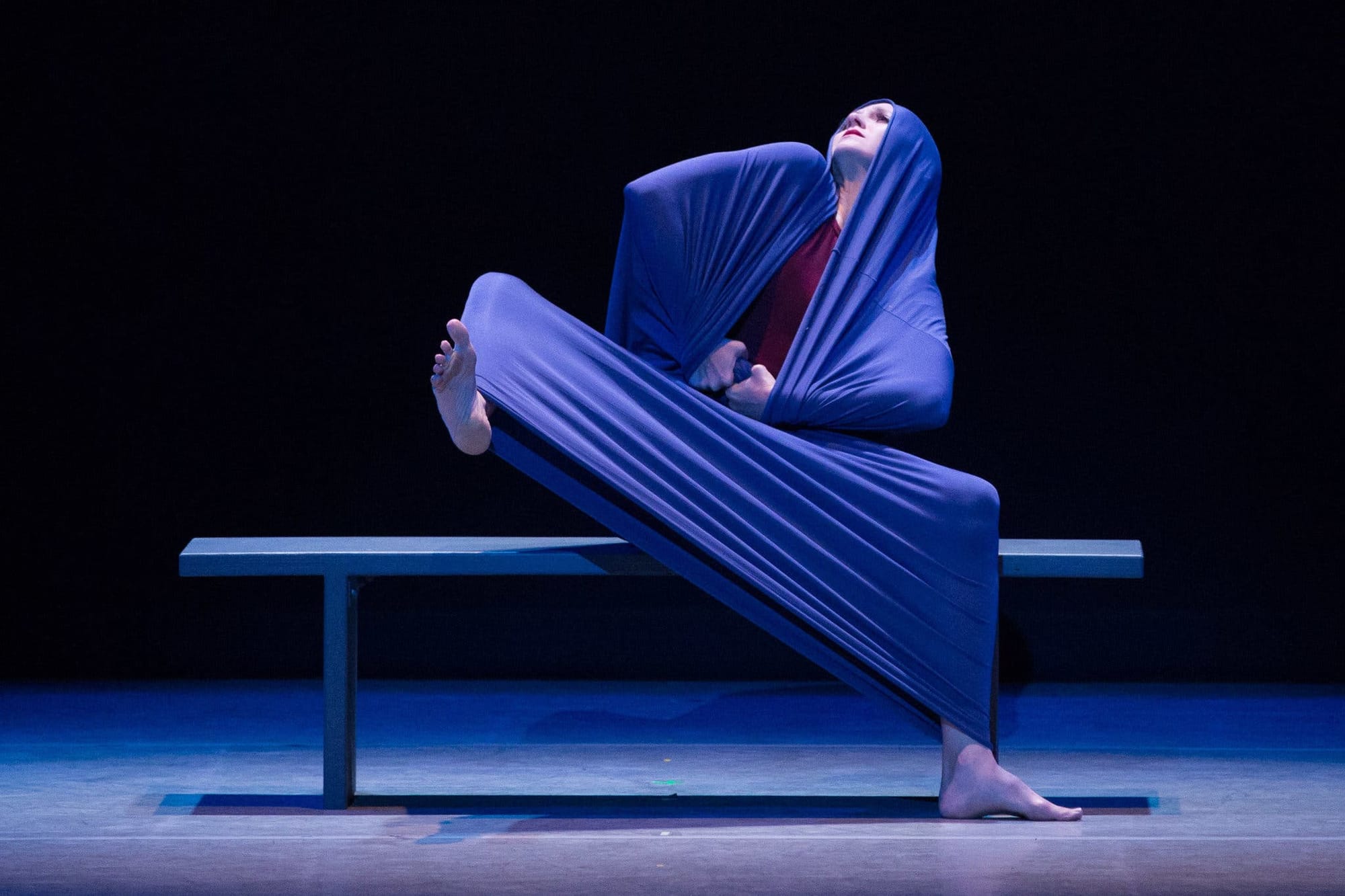 There were no shifting emotions in "Lament-ations", Martha Graham's powerful study of grief. Carla Körbes, the former much missed NYCB dancer who moved to the Pacific Northwest Ballet, has officially retired. But thanks to Woetzel ("I have loved Carla's dancing since I first saw her and wasn't about to let her actually stop!" he wrote) she returned to perform at Vail. Martha Graham's 1930 solo was one dance she learned there. Performed sitting on a bench, covered in a stretchy fabric cocoon and a monument to loss, Körbes' pale, haunted face resembled the Saint-Gaudens' statue "Grief". She moved with a calm but powerful inevitability, without anger or rebellion, too broken to do anything but mourn. It was timeless and haunting.